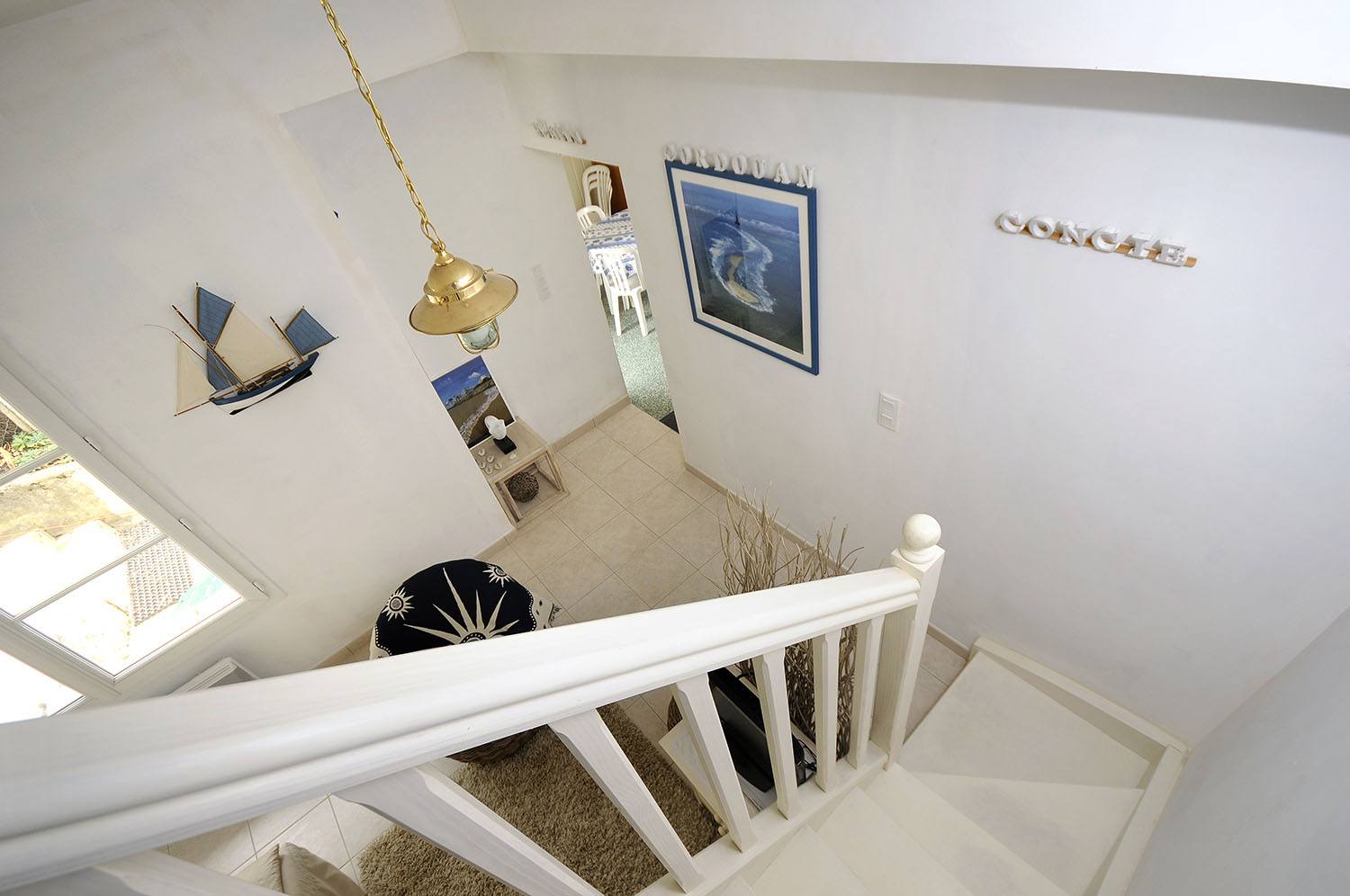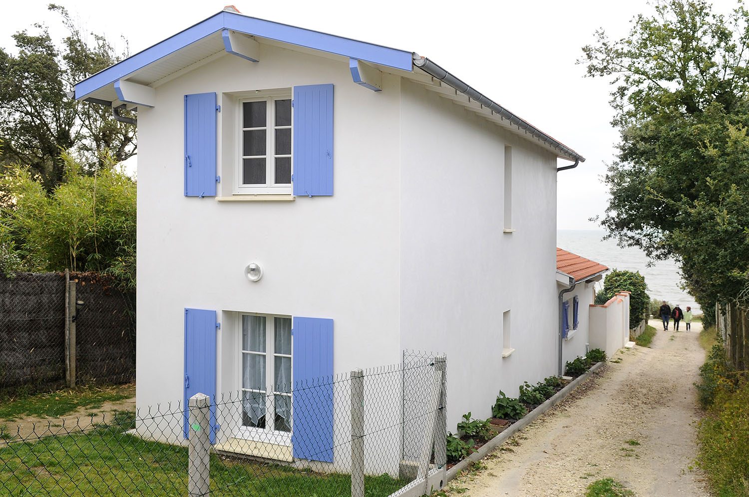 Cette maison est implantée en limite de propriété, le long de l’allée privée, face à l’estuaire de la Gironde, entre le phare de Terre-Nègre et celui de Cordouan, sur un terrain profond, de 8 mètres de large seulement. Le terrain pentu nous a contraints à proposer une structure avec des niveaux successifs ainsi qu’un drainage important pour renforcer l’étanchéité des murs du fait de l’écoulement des eaux sur un sol argileux et sableux.