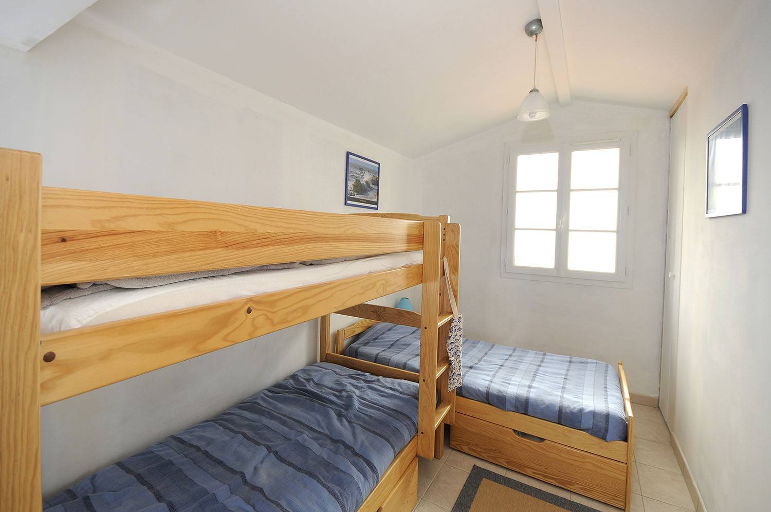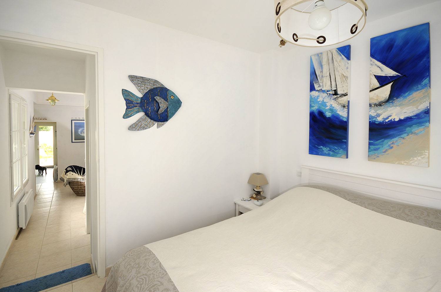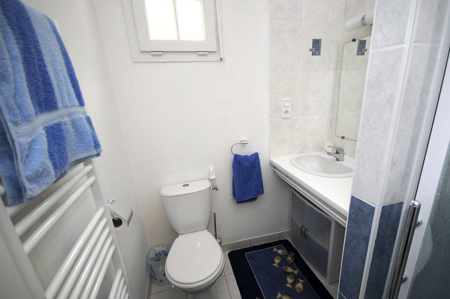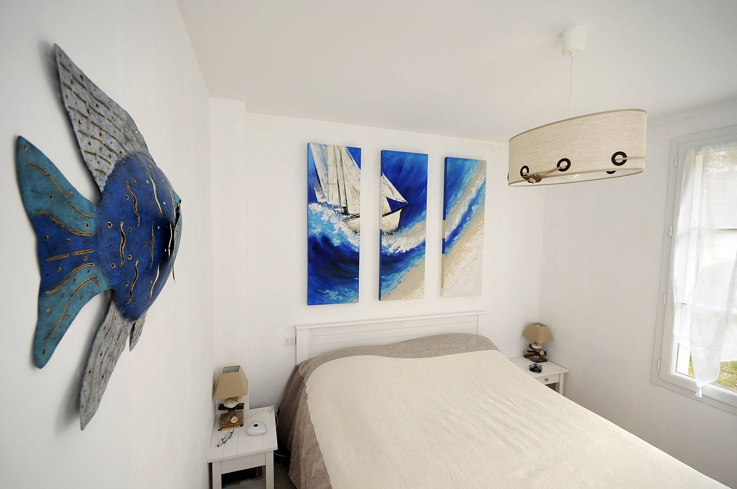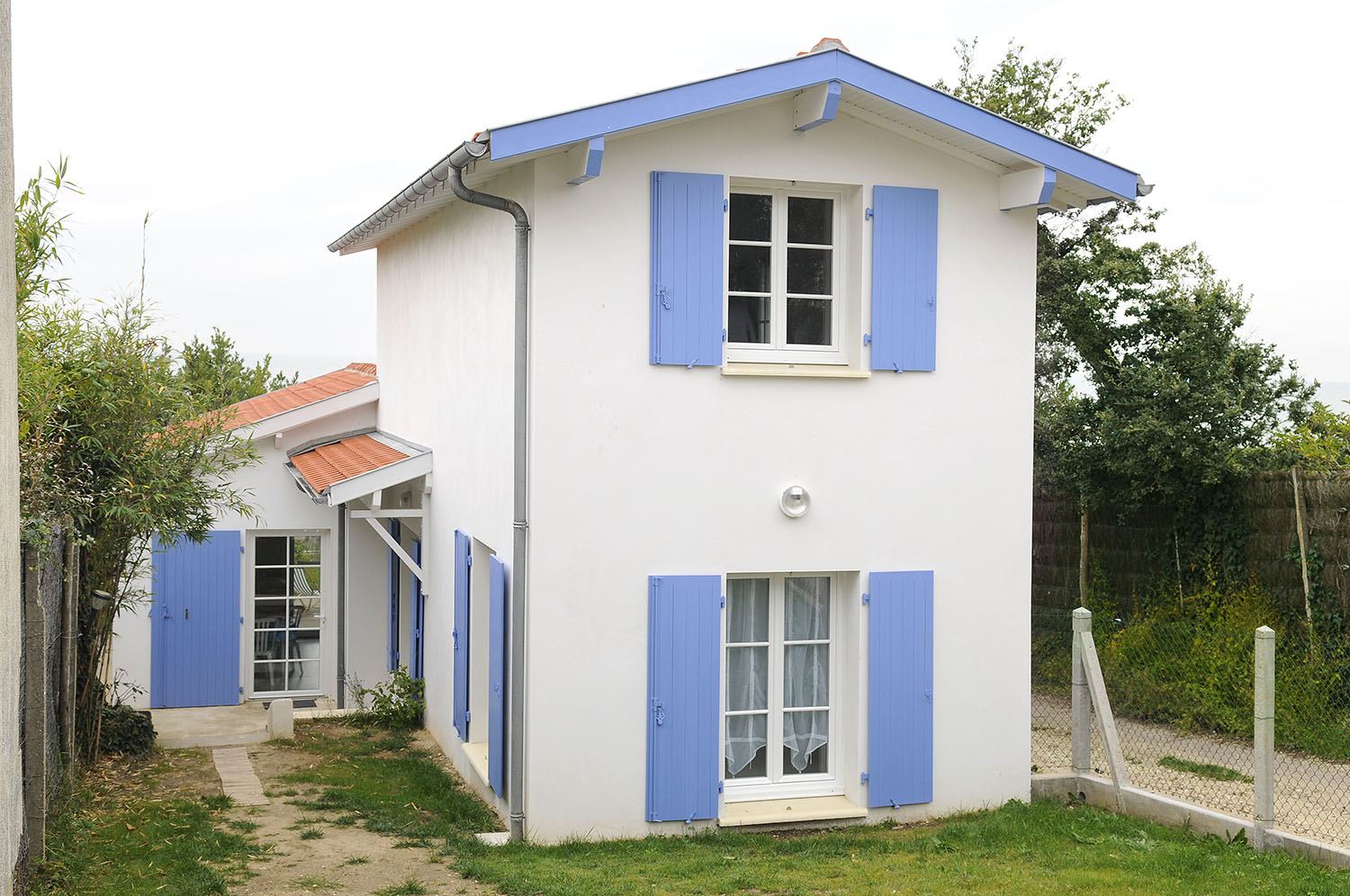 La partie existante a été agrandie à l’arrière, côté jardin, sur 2 niveaux. Au rez-de-chaussée, un séjour communique désormais avec la cuisine. Dans le prolongement du séjour, une nouvelle salle de bains et une chambre supplémentaire viennent compléter ce nouvel espace. Dans le séjour, un escalier dessert l’étage où on trouve maintenant les 2 chambres des enfants. Les fenêtres de la partie existante ont également été remplacées et la salle de bain a été rénovée. Un auvent-terrasse vient habiller la façade avant côté mer.