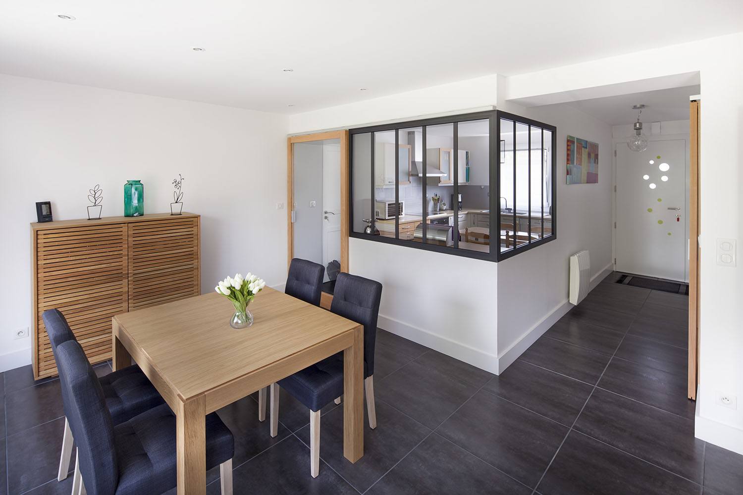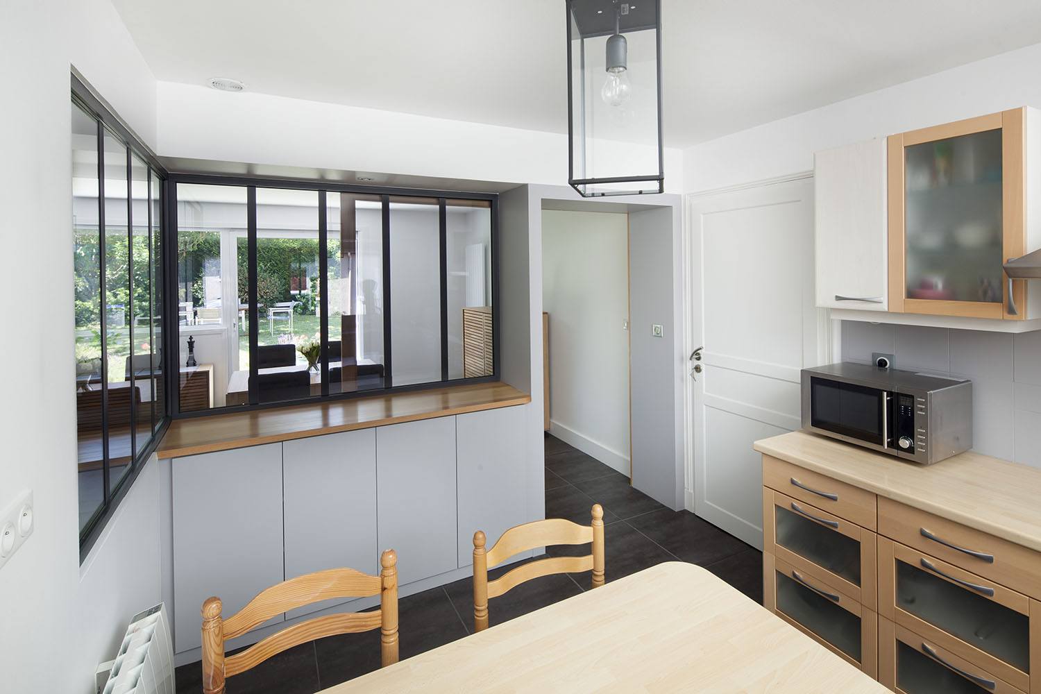 L’espace cuisine a été transformé en verrière façon atelier, afin de conserver un espace cloisonné, mais totalement transparent et ouvert sur le séjour. La partie basse a permis de créer un espace de rangement. Le mobilier et la faïence ont été modernisés grâce à des astuces de peinture aux couleurs gris et hêtre.