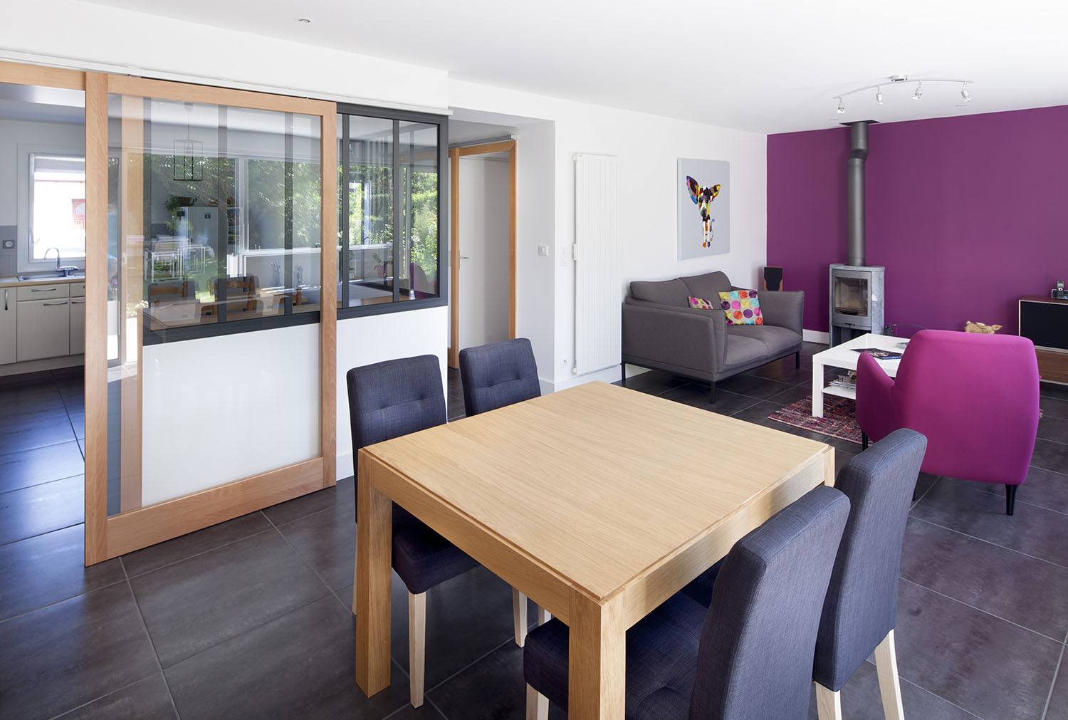 Le nouveau carrelage aux couleurs gris béton et les tons prune sur les murs viennent compléter ce nouvel agencement contemporain. Un poêle à bois design remplace avantageusement l’ancienne cheminée.