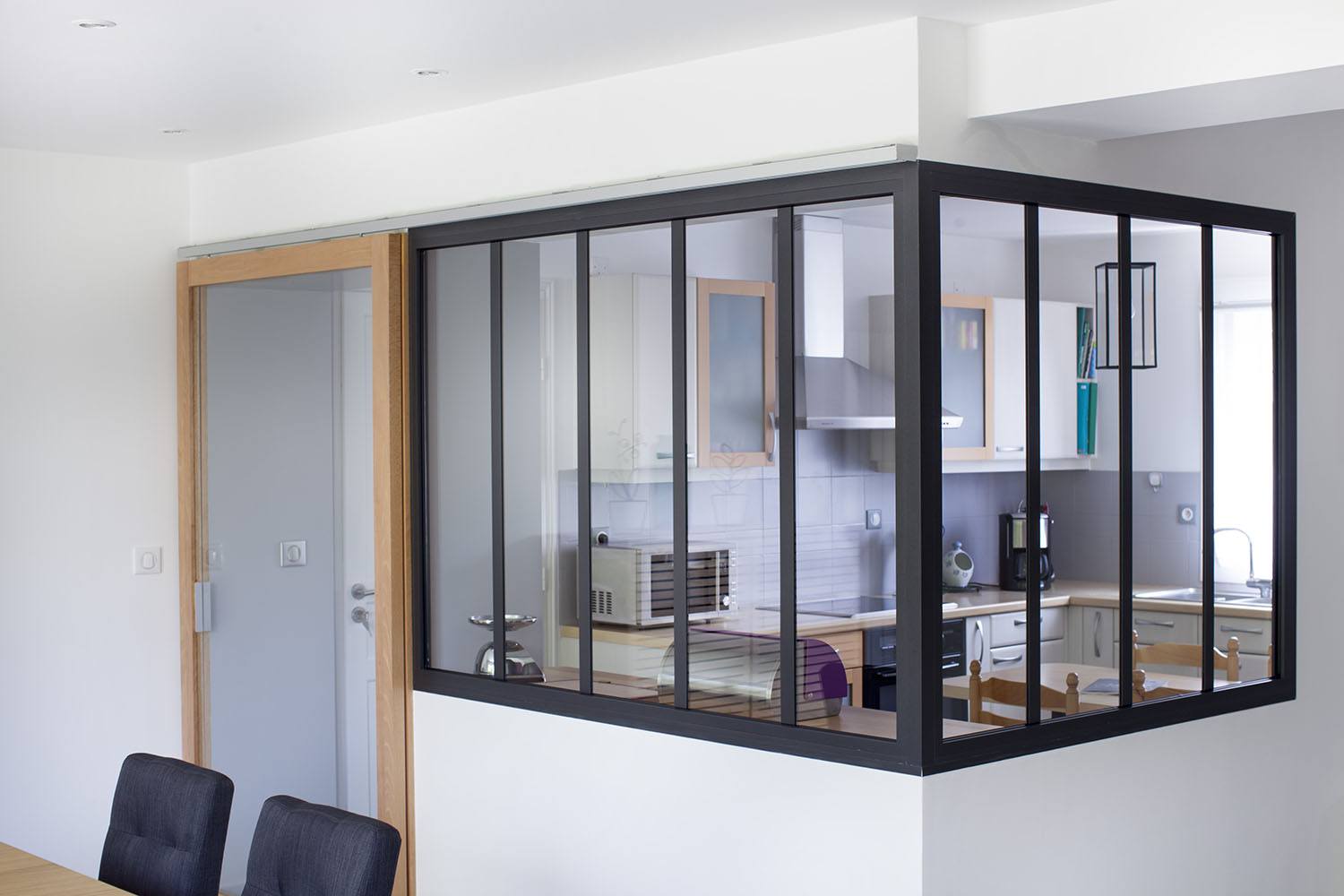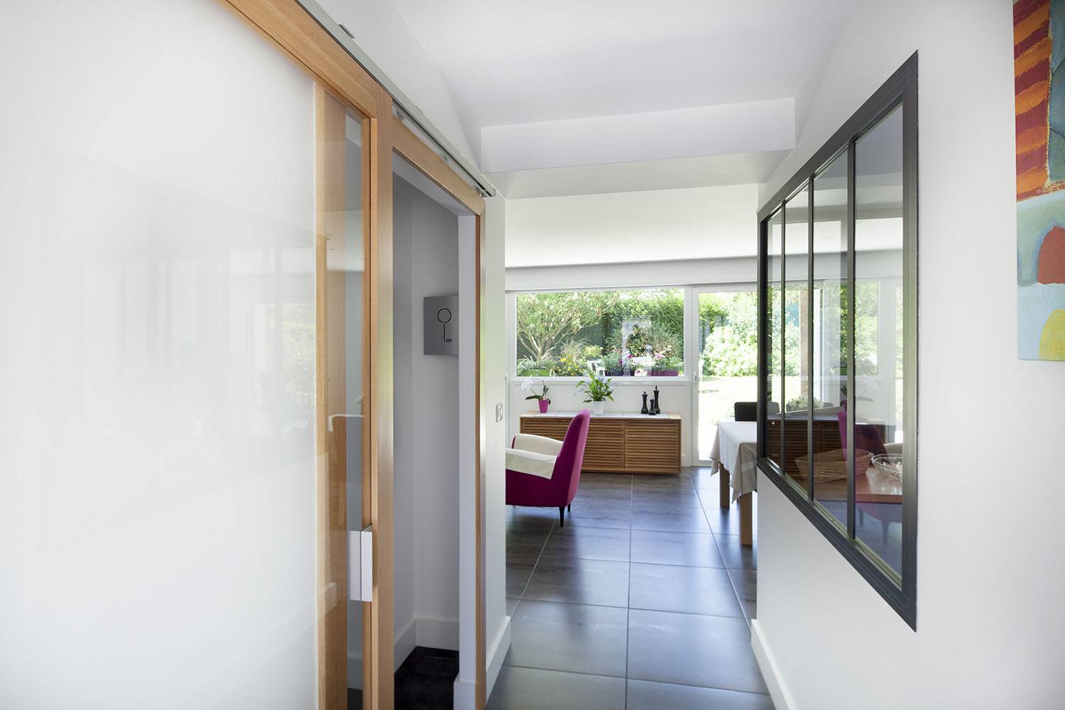 Afin de compléter cette volonté de transparence, un jeu de portes coulissantes intérieures vitrées a été intégré dans le hall d’entrée pour délimiter les espaces tout en apportant de la lumière.