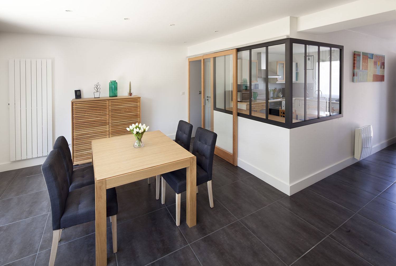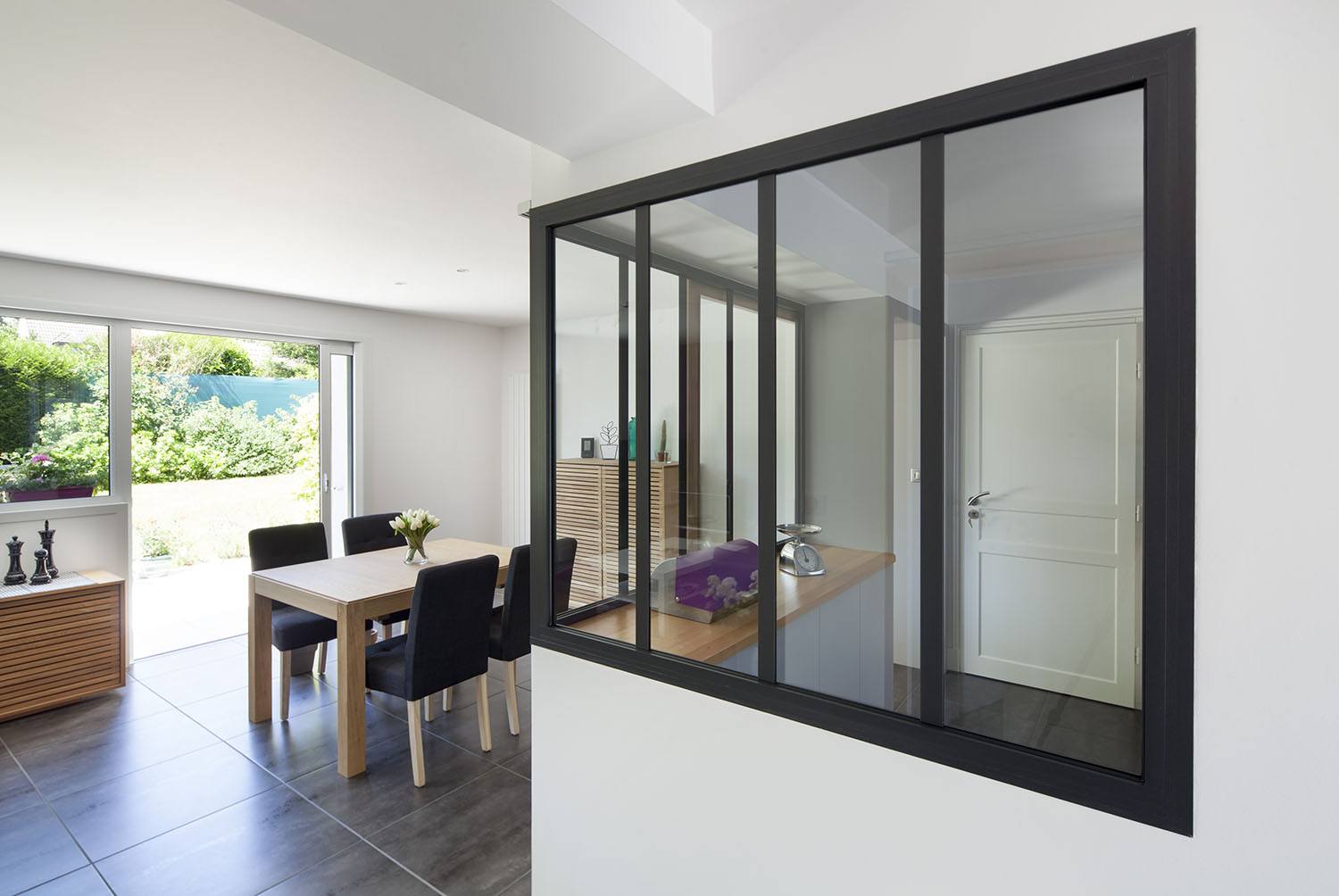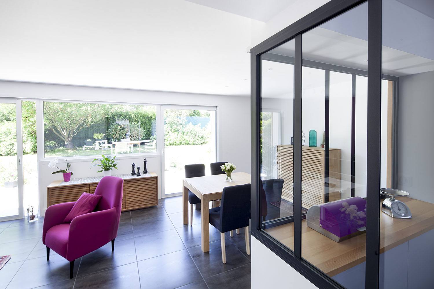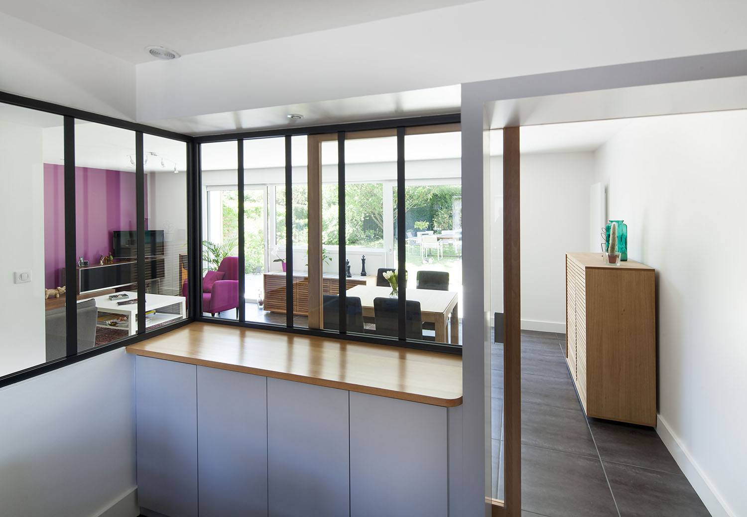 Pour répondre à cette demande d’aménagement à Nantes, nous avons créé deux grandes baies vitrées coulissantes côté jardin, de part et d’autre d’une partie centrale, vitrée à mi-hauteur, qui permet de recevoir un meuble bas.