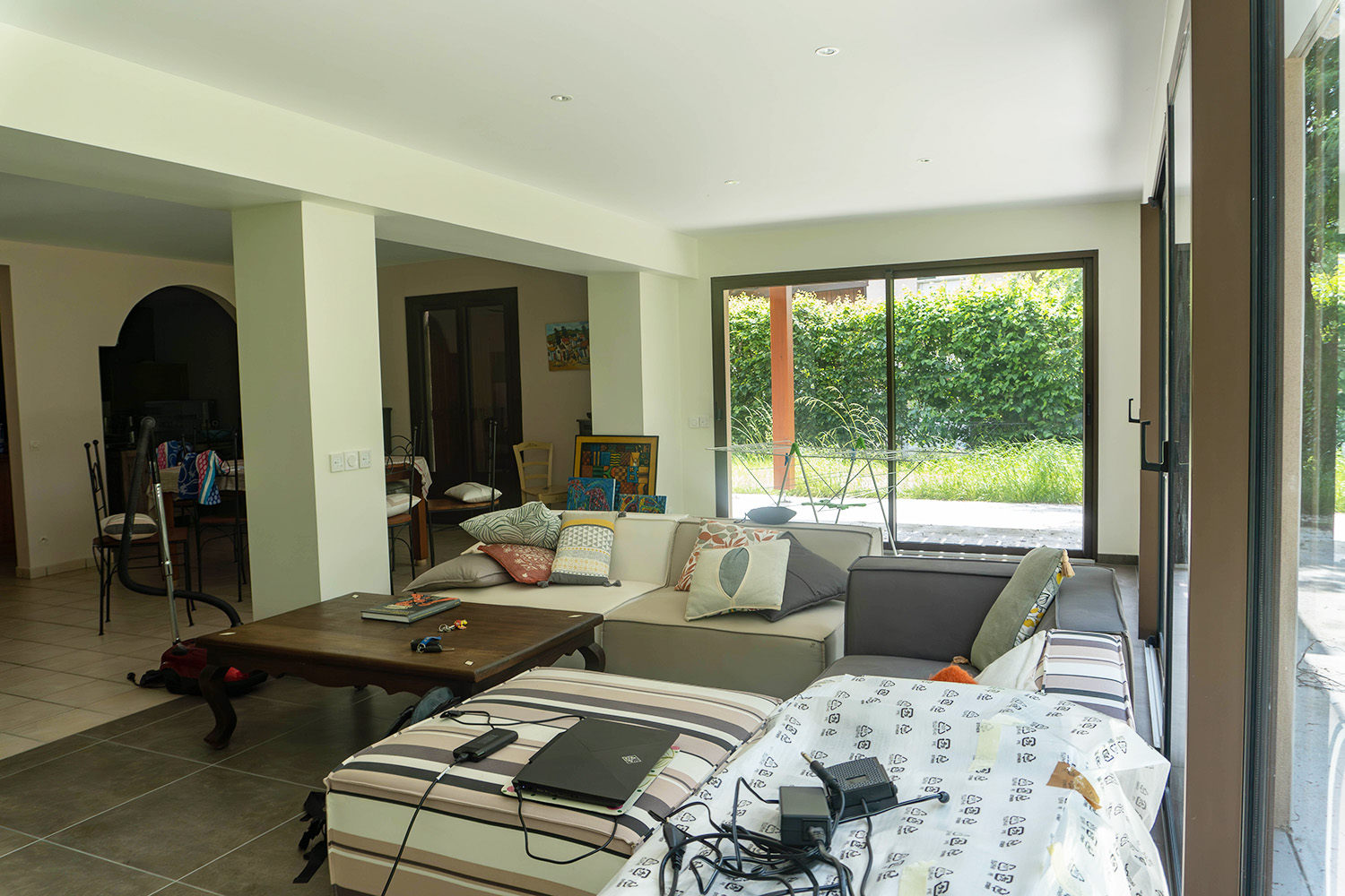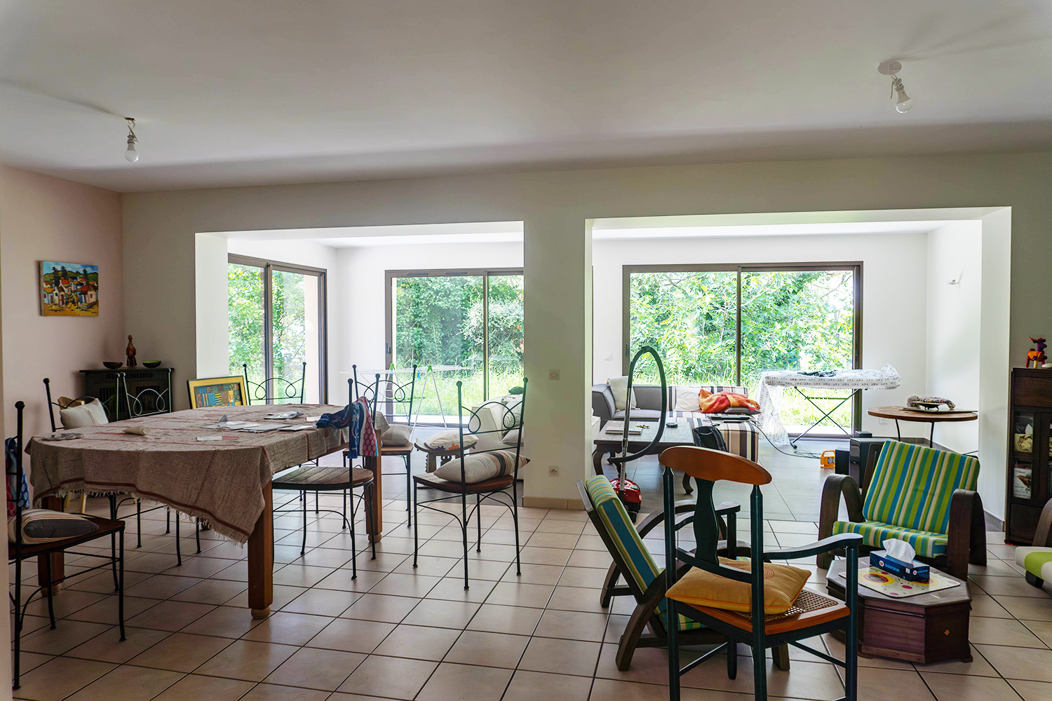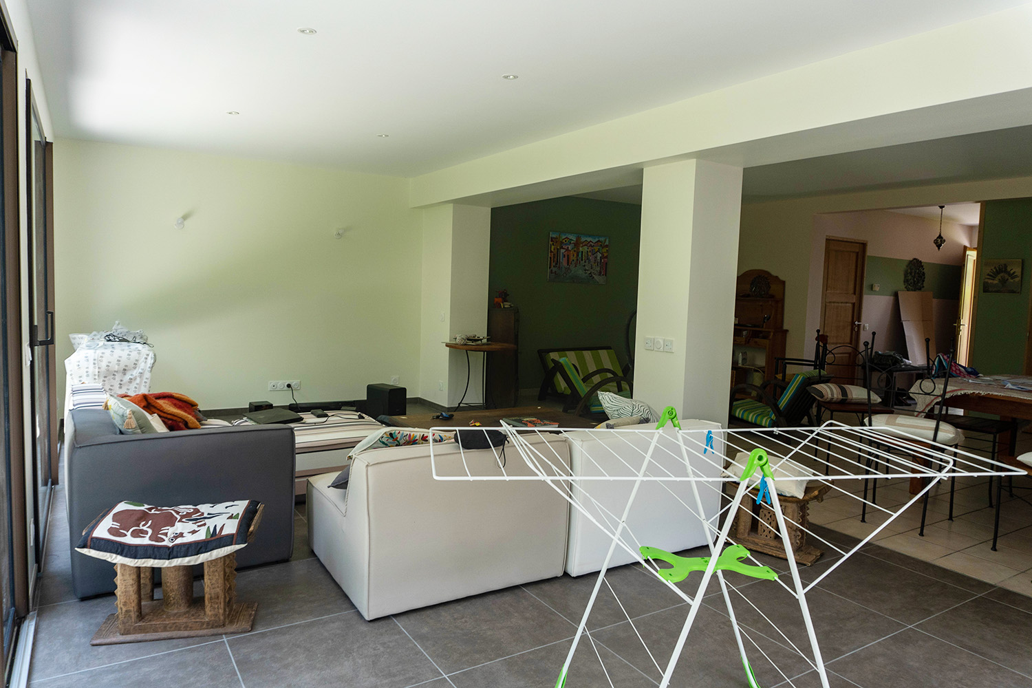 Au sol, de grandes dalles gris clair ont été posées, et les murs sont percés de larges baies vitrées sur deux façades. La lumière naturelle y rentre de façon généreuse !