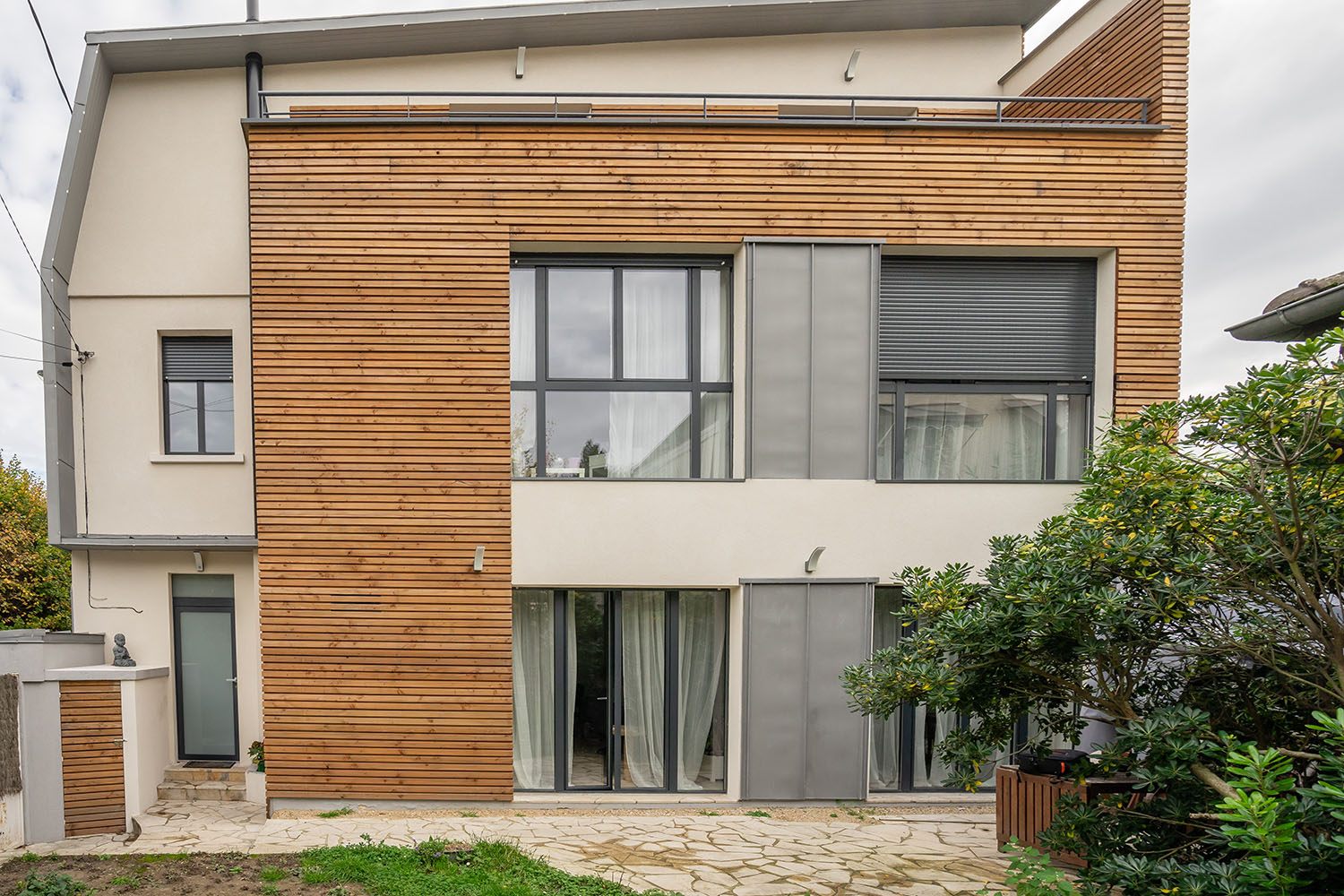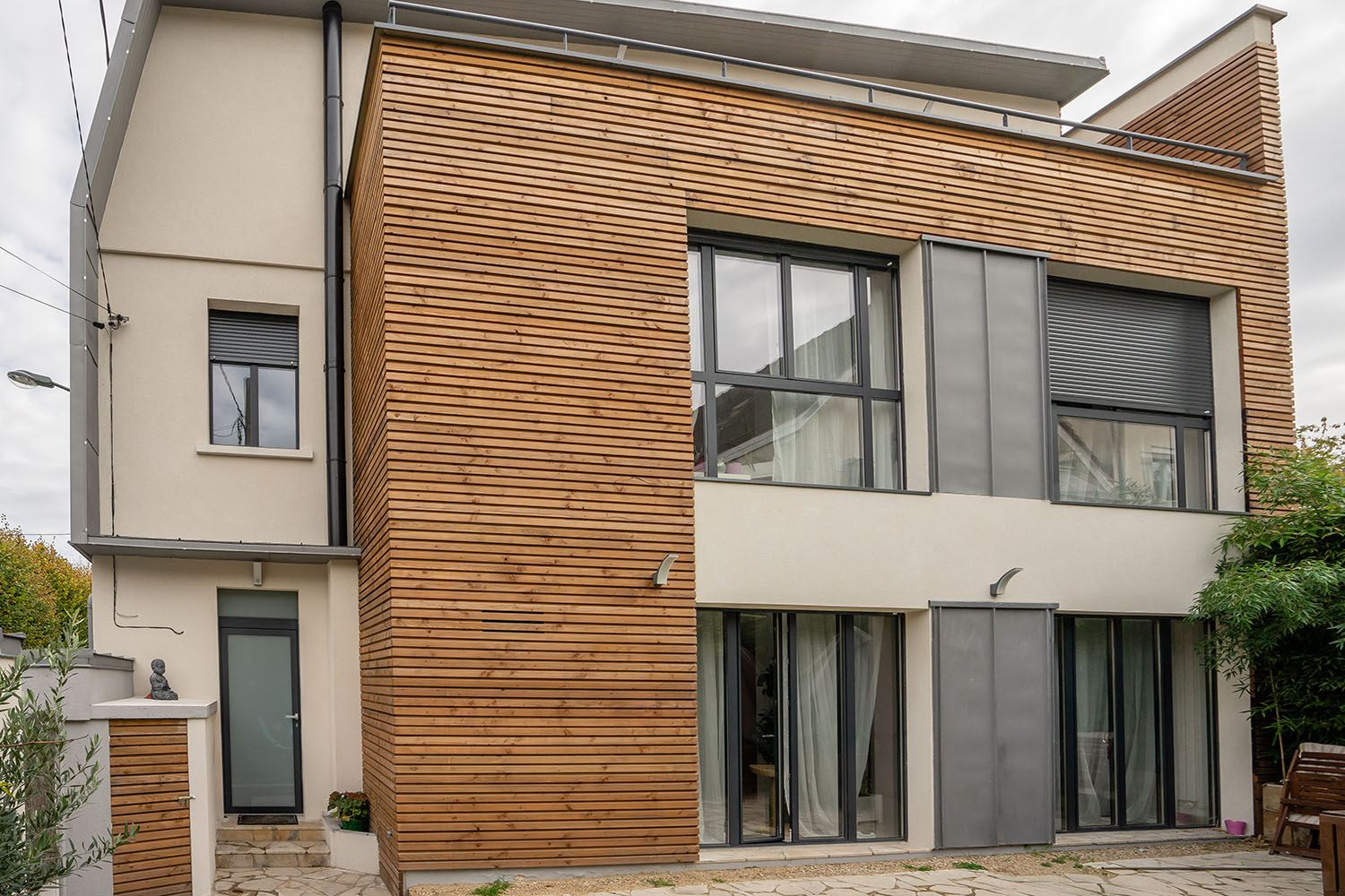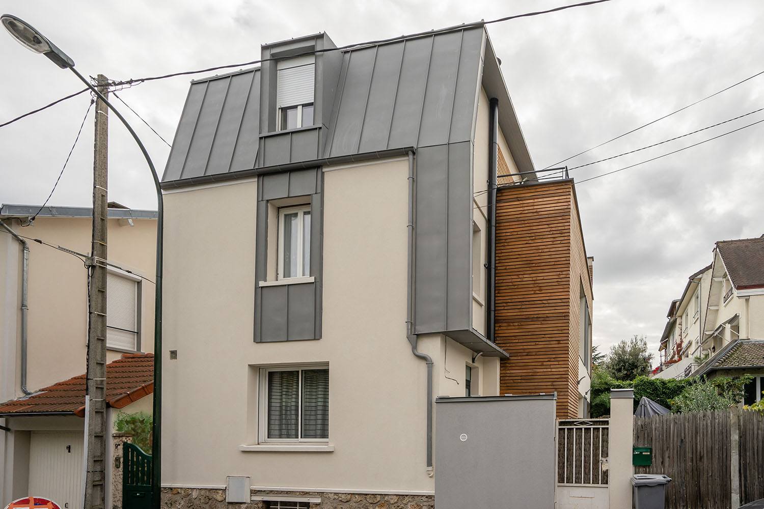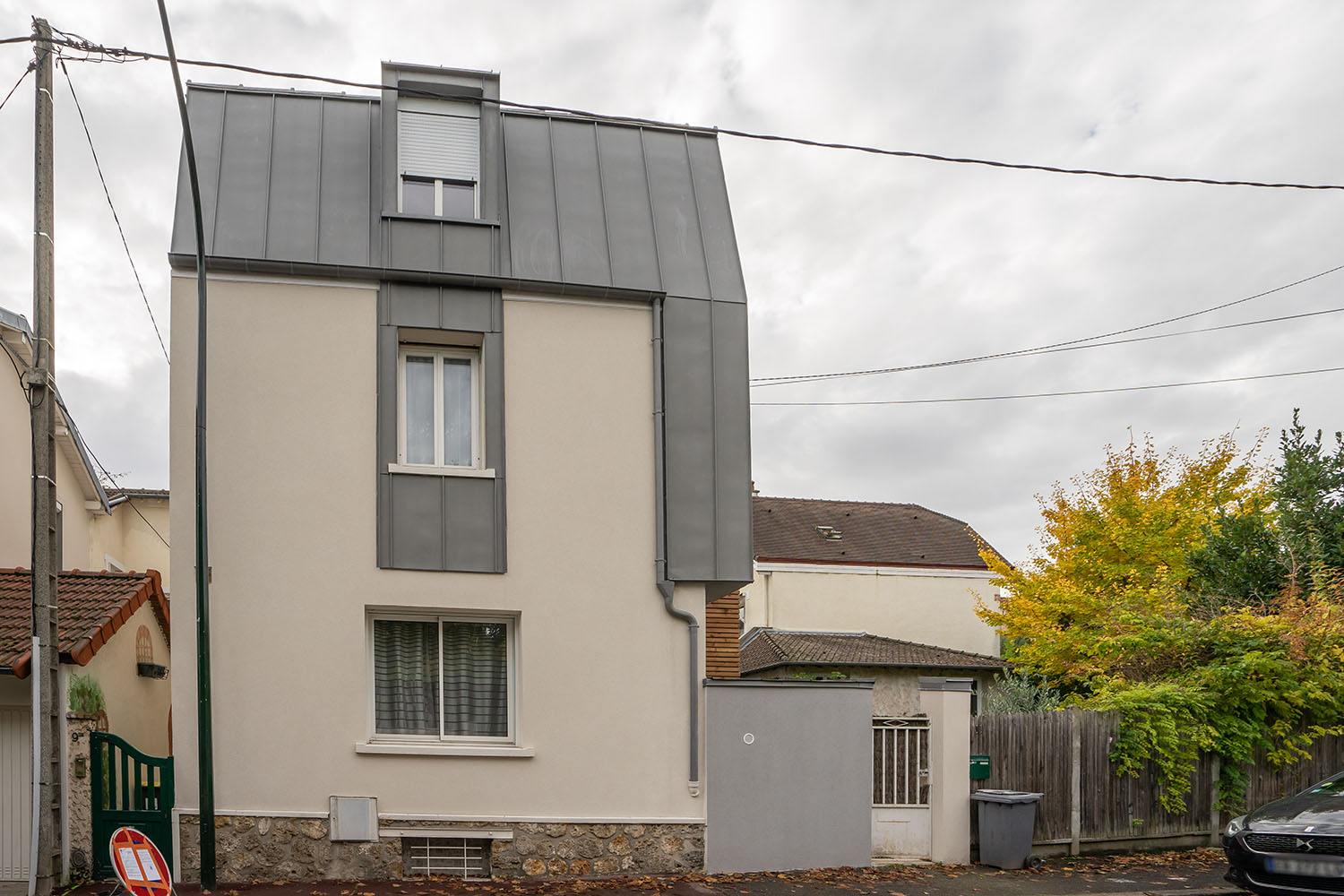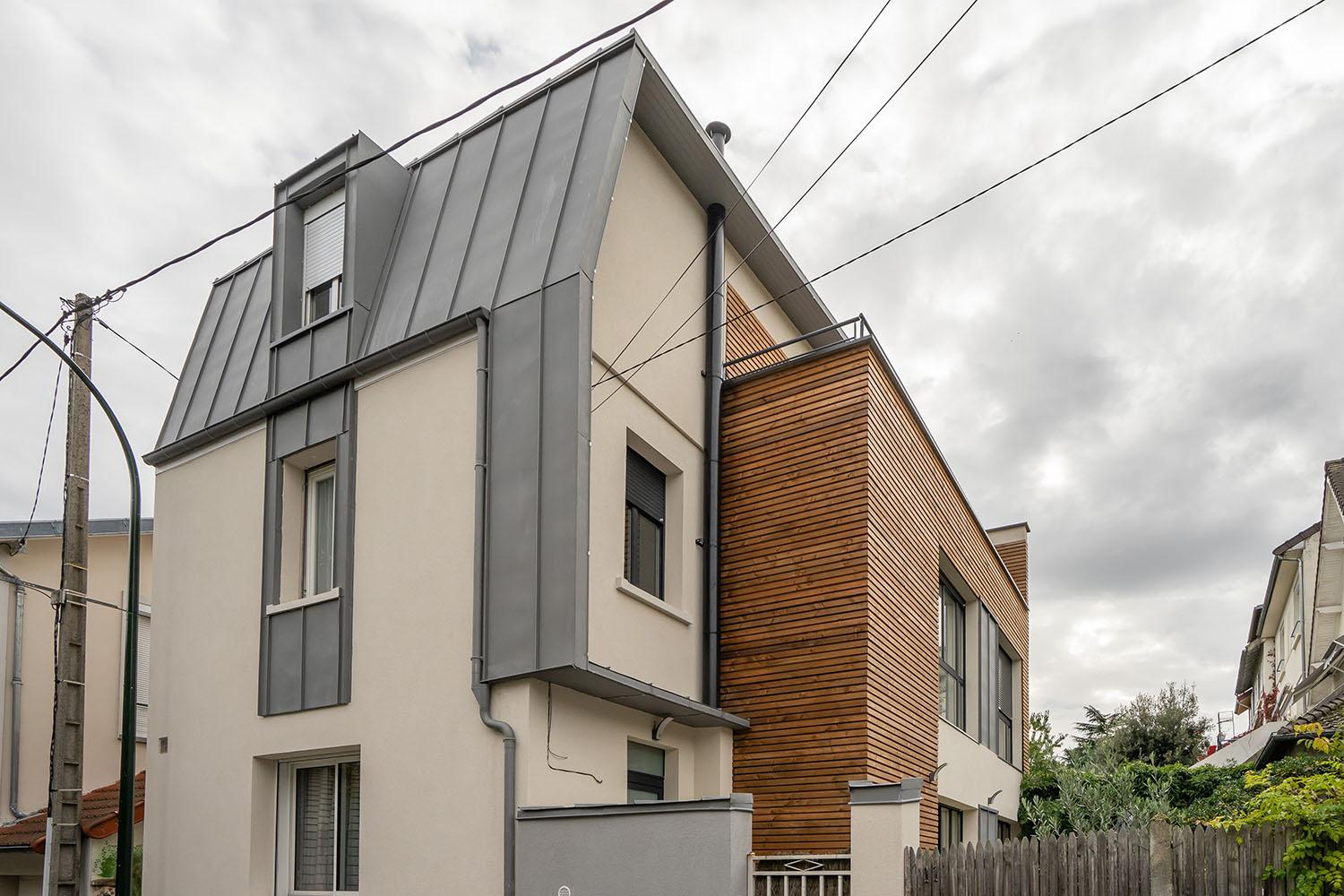 Nous avons été sollicités pour l’agrandissement d’une maison à Boulogne-Billancourt. Comme souvent dans les villes à forte densité de population, la surface au sol est assez réduite. C’est pourquoi nous avons proposé à notre couple de clients franciliens de procéder à une surélévation de leur maison pour gagner 85m² de surface habitable supplémentaire, en diminuant au maximum l’impact sur le terrain. Nous avons donc imaginé une surélévation sur 2 niveaux avec une partie mansardée et une partie toit-terrasse.