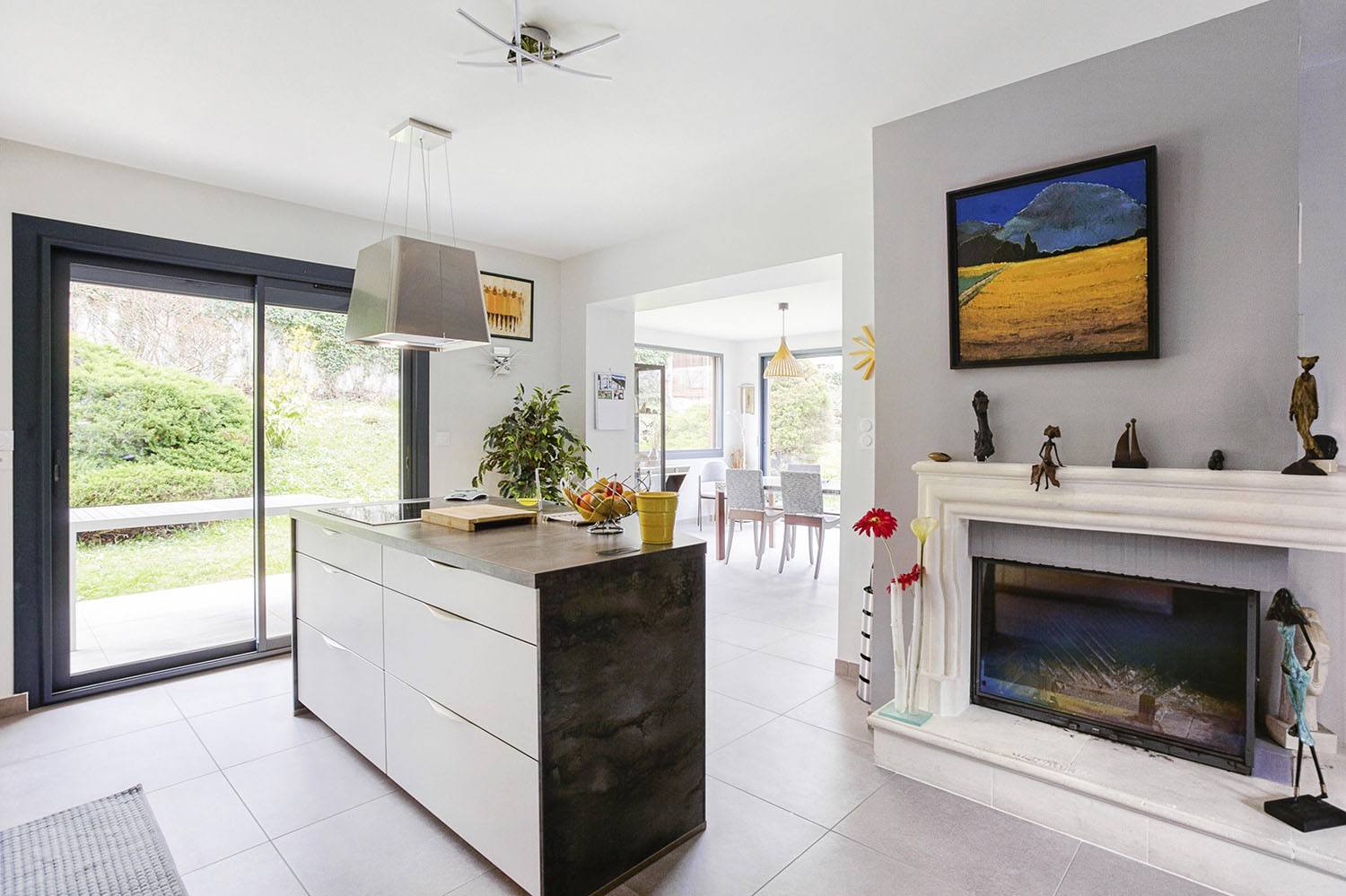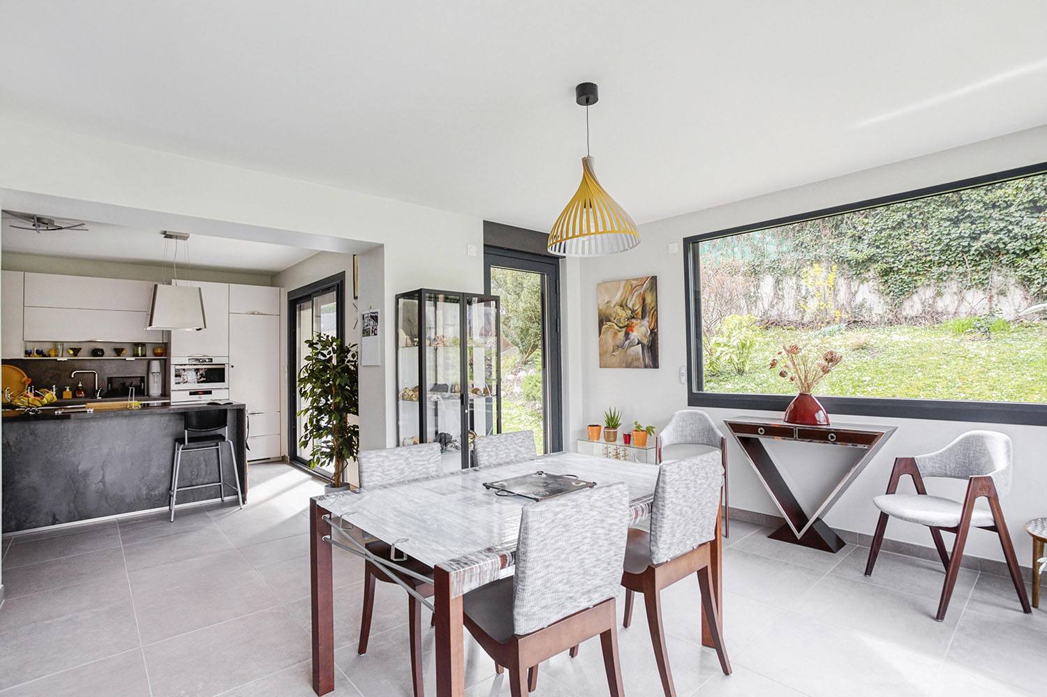 La nouvelle cuisine, équipée d’un îlot central, offre un espace fonctionnel et esthétique. De grandes baies vitrées ouvrent l’extension vers l’extérieur, permettant une belle luminosité naturelle et une connexion harmonieuse avec le jardin.