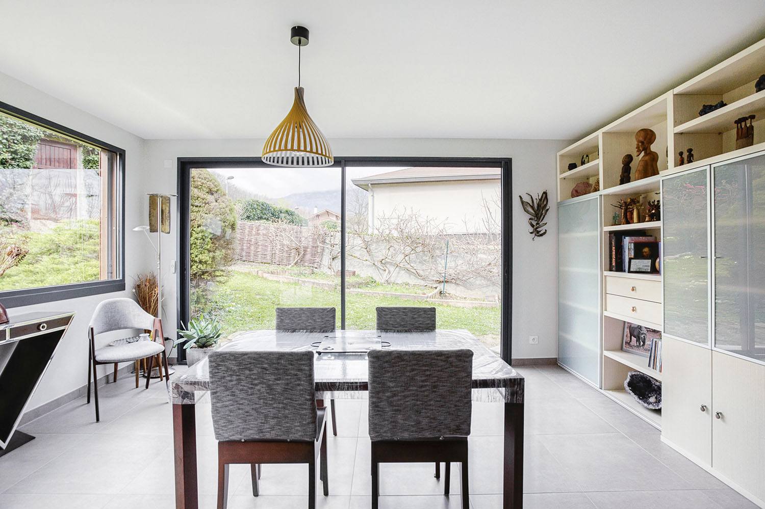 Cette extension accueille désormais une cuisine ouverte et une salle à manger, transformant l’espace de vie en un lieu convivial et lumineux.