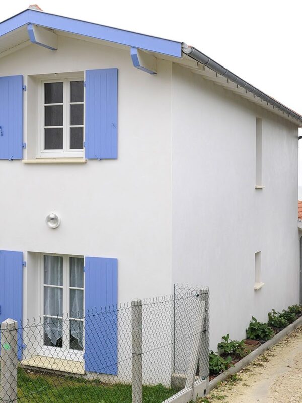 La partie existante a été agrandie à l’arrière, côté jardin, sur 2 niveaux. Au rez-de-chaussée, un séjour communique désormais avec la cuisine. Dans le prolongement du séjour, une nouvelle salle de bains et une chambre supplémentaire viennent compléter ce nouvel espace. Dans le séjour, un escalier dessert l’étage où on trouve maintenant les 2 chambres des enfants. Les fenêtres de la partie existante ont également été remplacées et la salle de bain a été rénovée. Un auvent-terrasse vient habiller la façade avant côté mer.