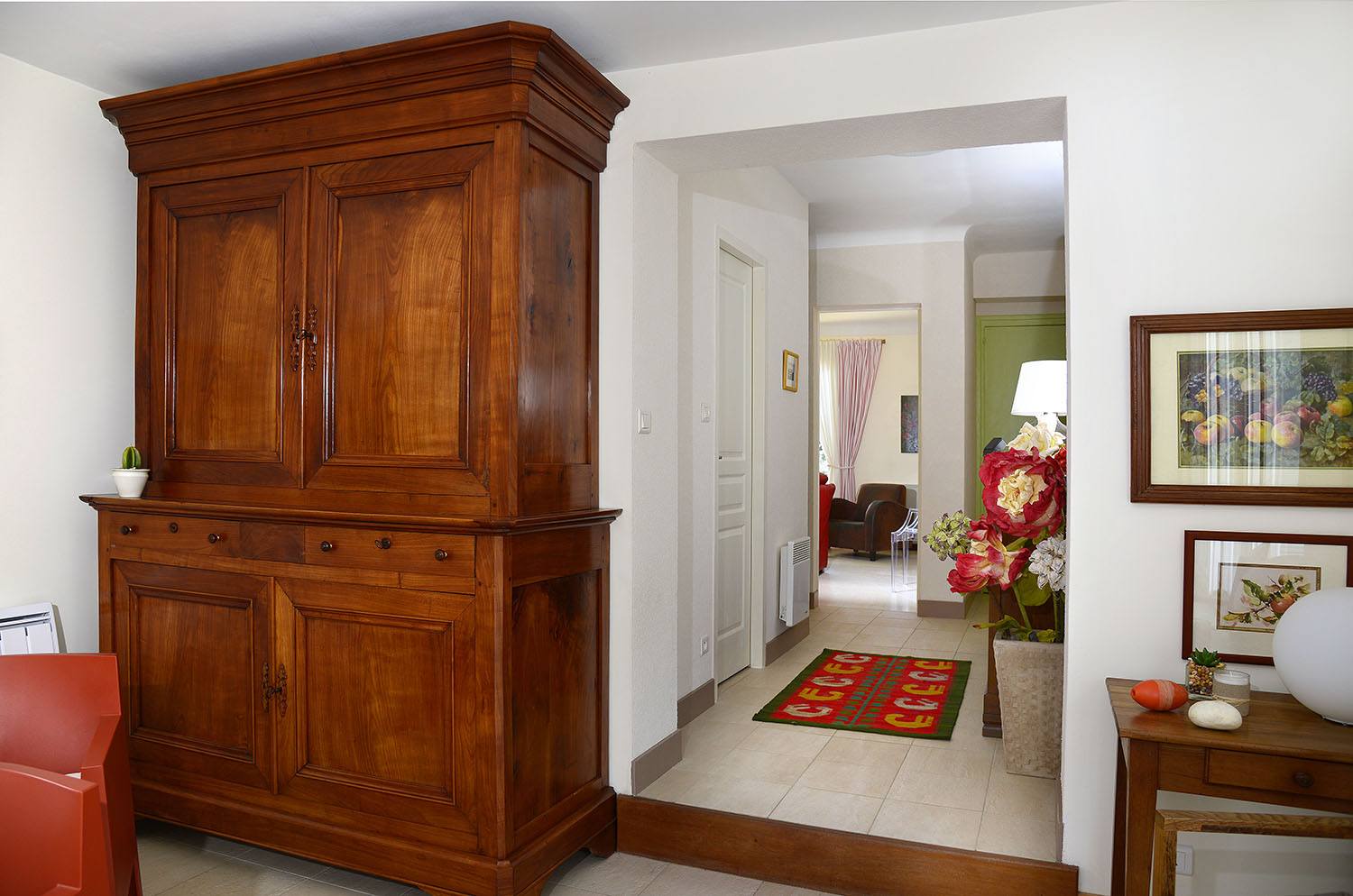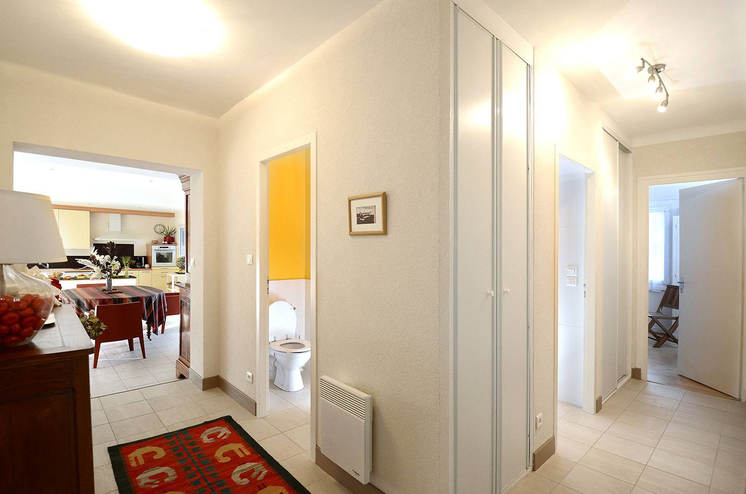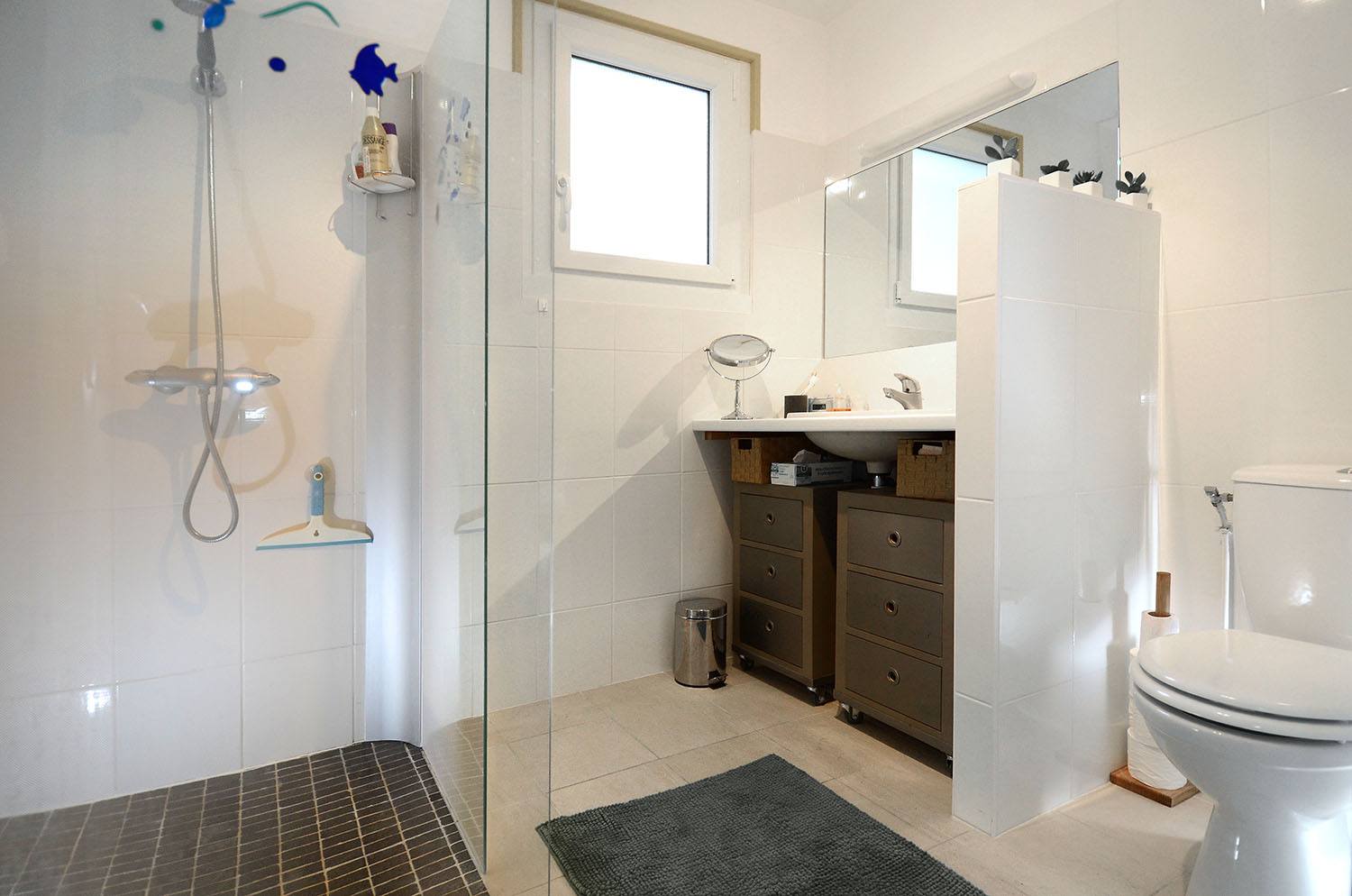 A la place de l’ancienne cuisine, un dégagement permet désormais d’accéder à l’extension. La salle de bains vieillissante a été modernisée avec une douche à l’italienne et des toilettes intégrées.