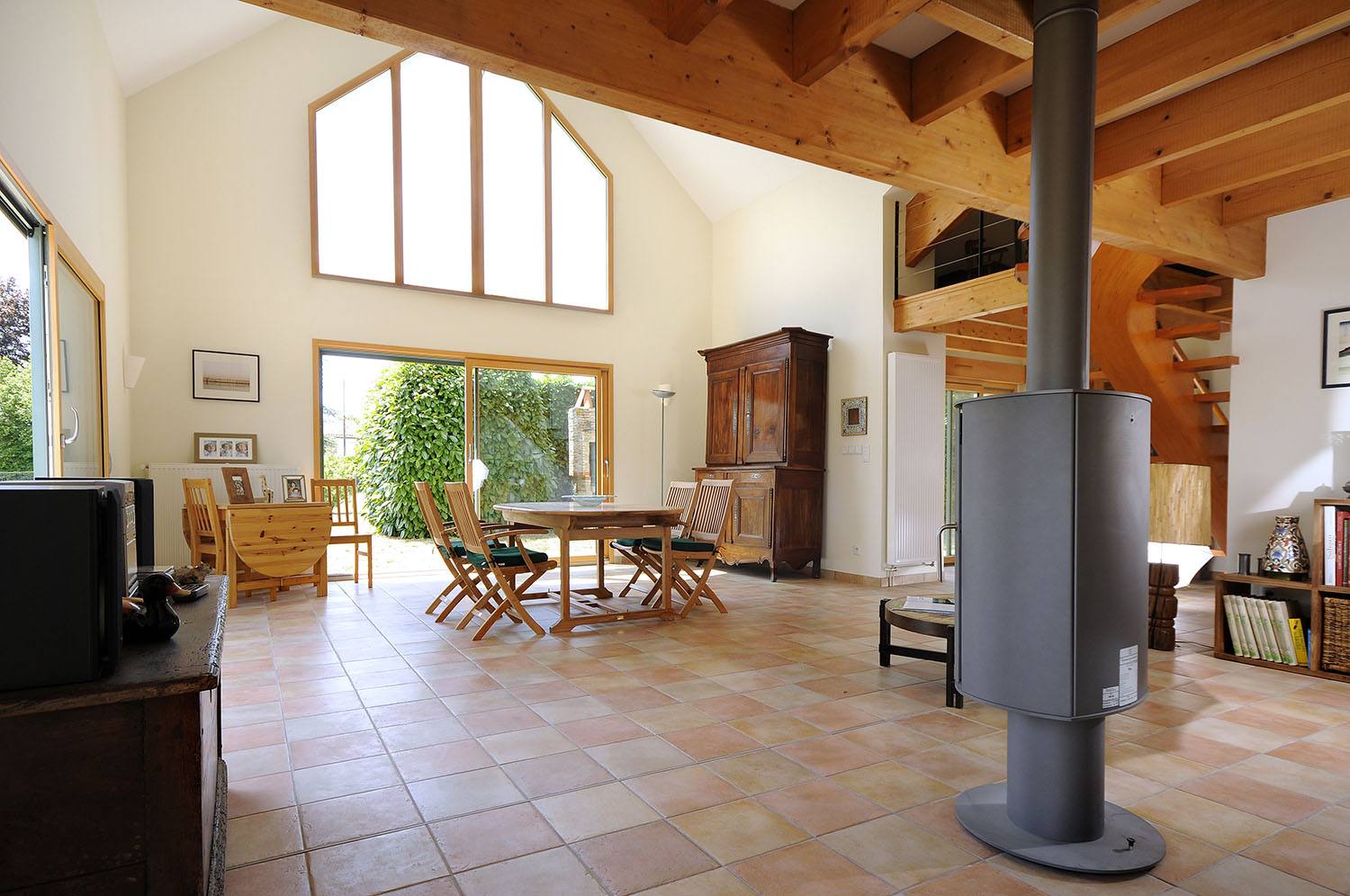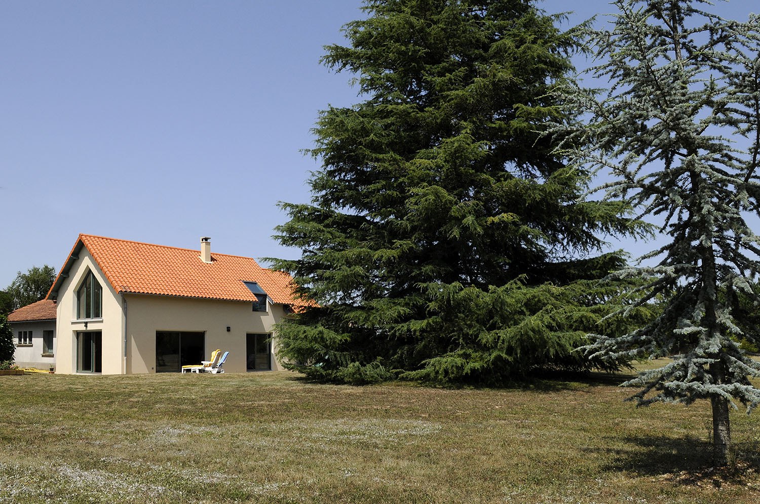 Nous avons volontairement implanté cette extension perpendiculairement à la partie existante afin de casser les volumes et d’alléger la charpente. Nous avons fait le choix d’une charpente avec une seule panne, en lamellé collé, sans bois apparent, permettant de donner à l’ensemble un aspect plus contemporain et moins coûteux.