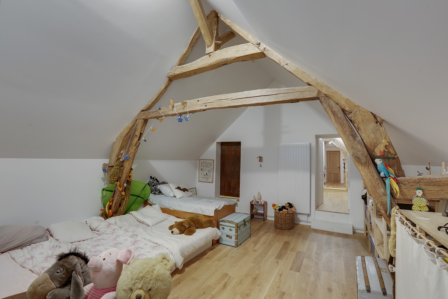 Il a été décidé de conserver la belle ossature de bois visible tout comme la généreuse hauteur sous plafond afin de valoriser la structure des combles. Une cloison a été posée en son milieu pour former deux espaces destinés aux enfants : d’un côté un dortoir cosy, de l’autre une petite salle de jeux. Dans le couloir, des rangements courent le long des murs pour optimiser l’espace.