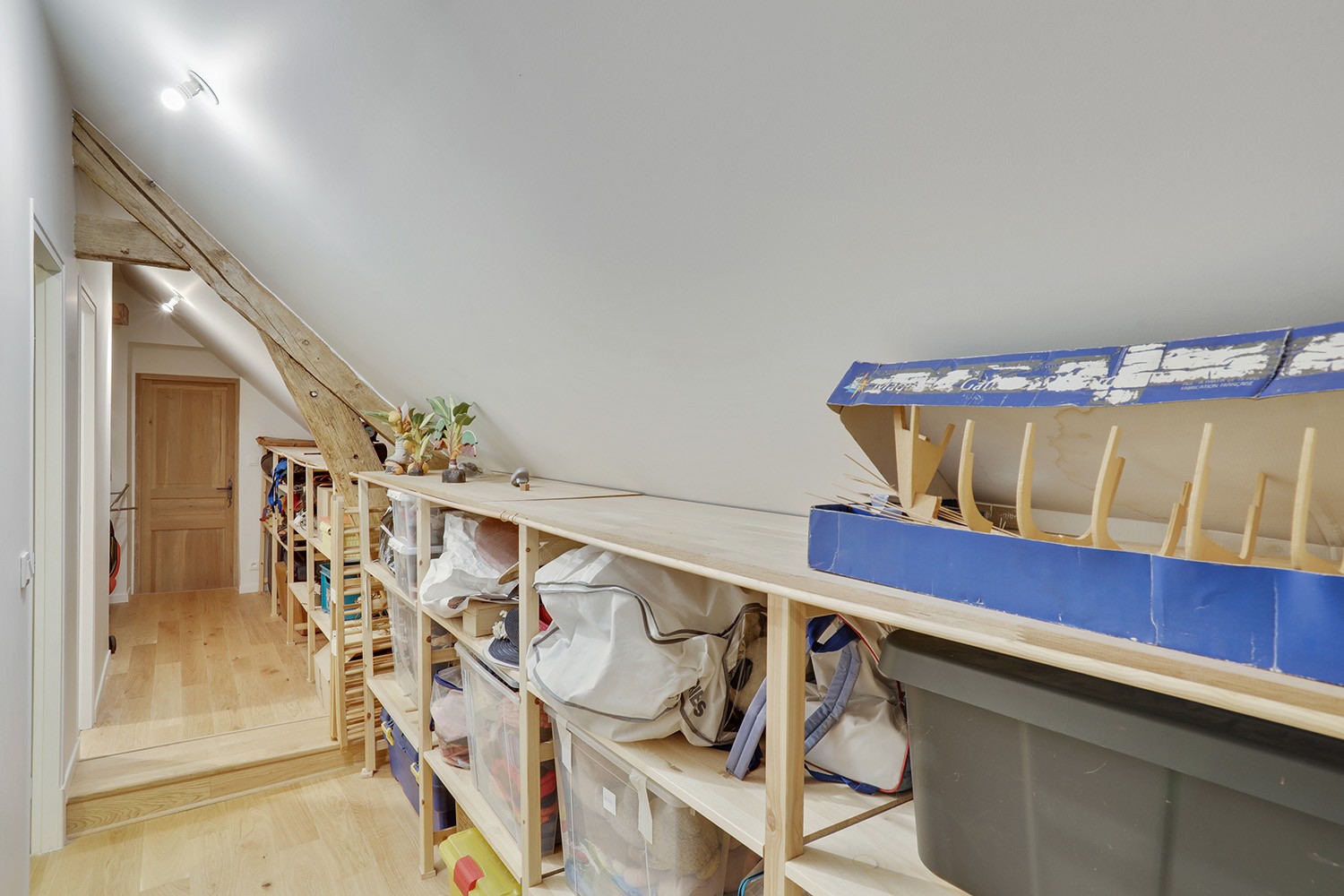 A noter : la cloison s’arrête en hauteur au niveau des poutres, les quelques dizaines de centimètres dans la partie triangulaire ont vu la pose d’une verrière intérieure pour apporter de la clarté à l’ensemble des combles.