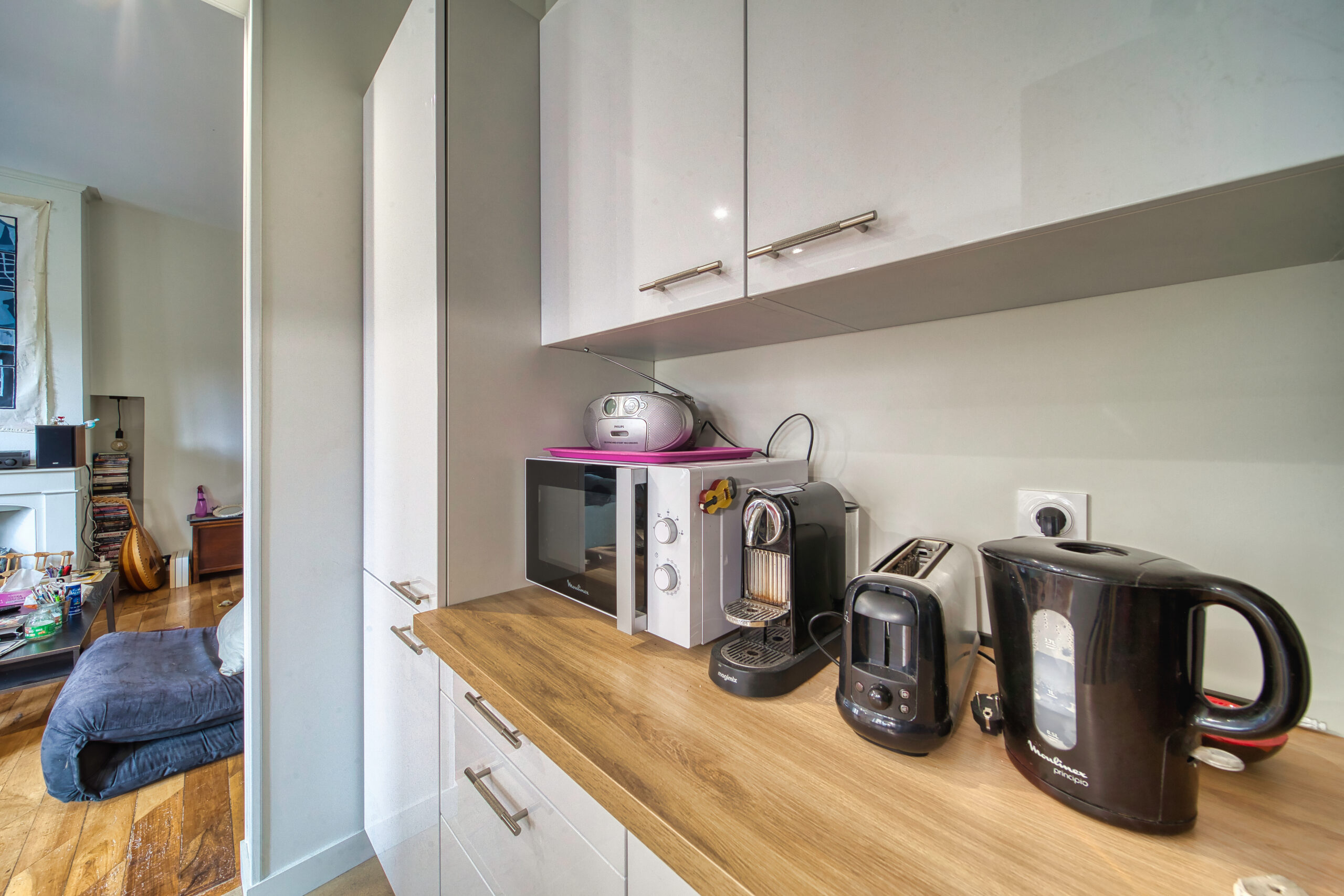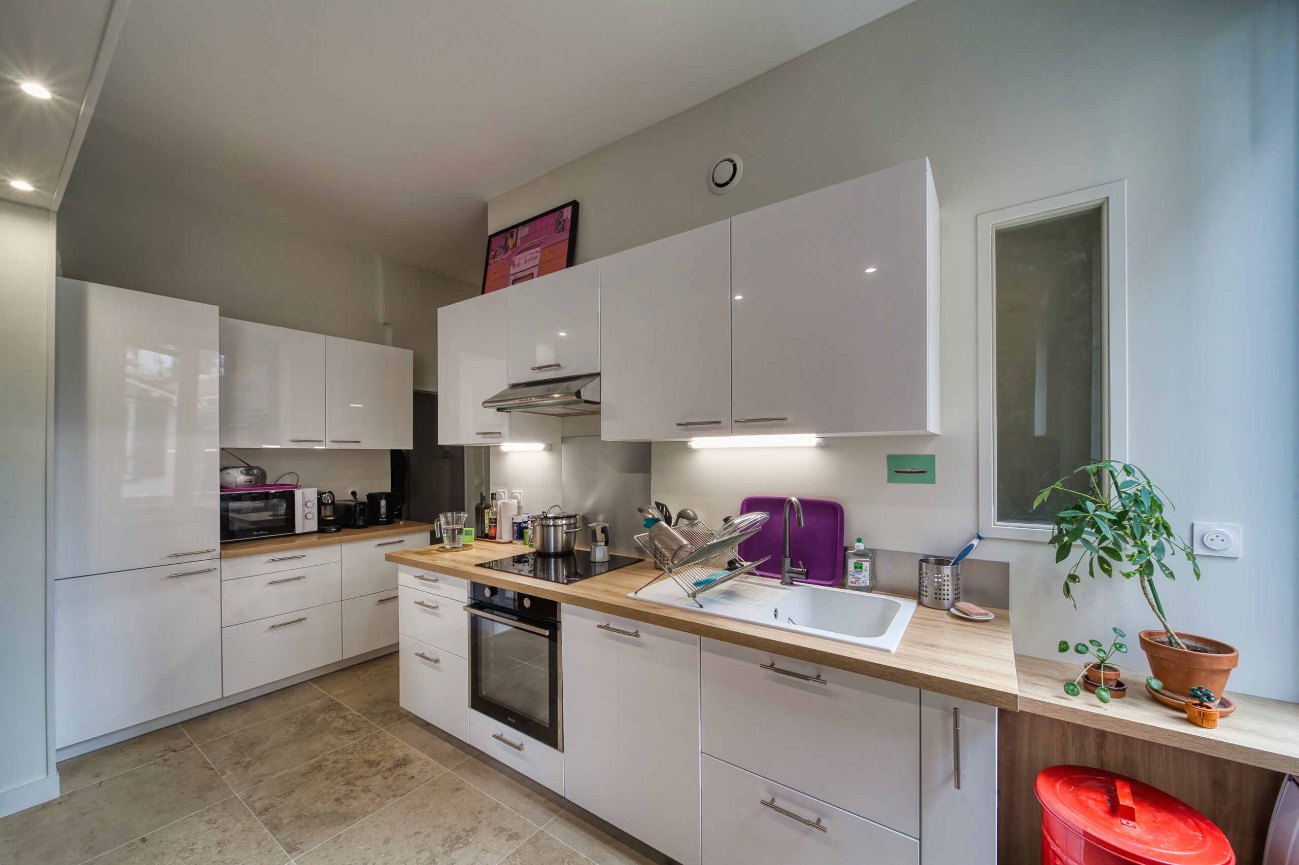 La cuisine a fait peau neuve avec une rénovation complète comprenant la dépose de l’existant puis un nouvel aménagement. Aujourd’hui, elle est ouverte sur le séjour avec un carrelage de grande taille qui fait une transition douce avec le parquet voisin. Son plan de travail en bois clair apporte de la chaleur à la pièce, et ses meubles blanc et beige clair donnent une touche épurée à l’ensemble.
