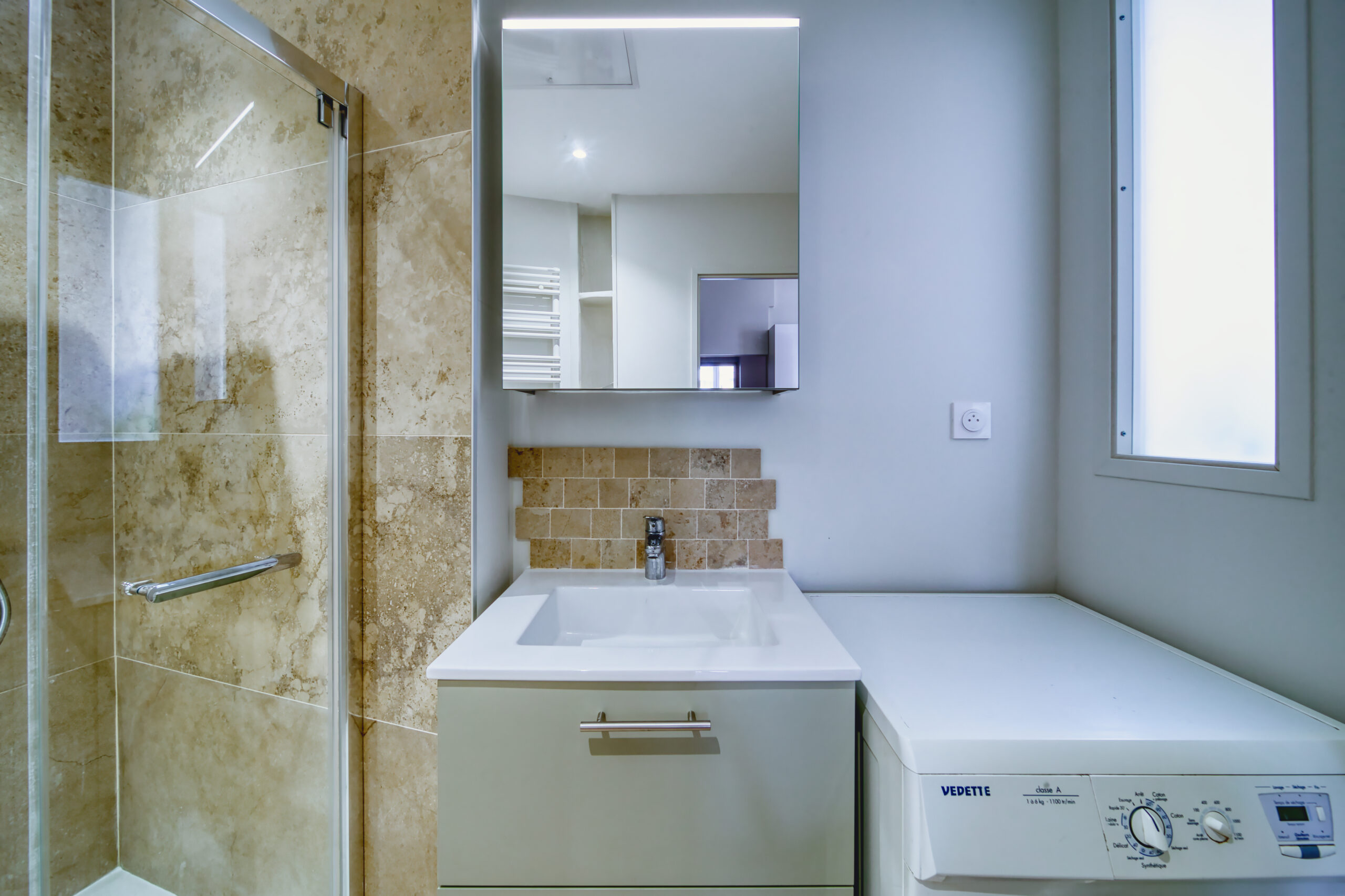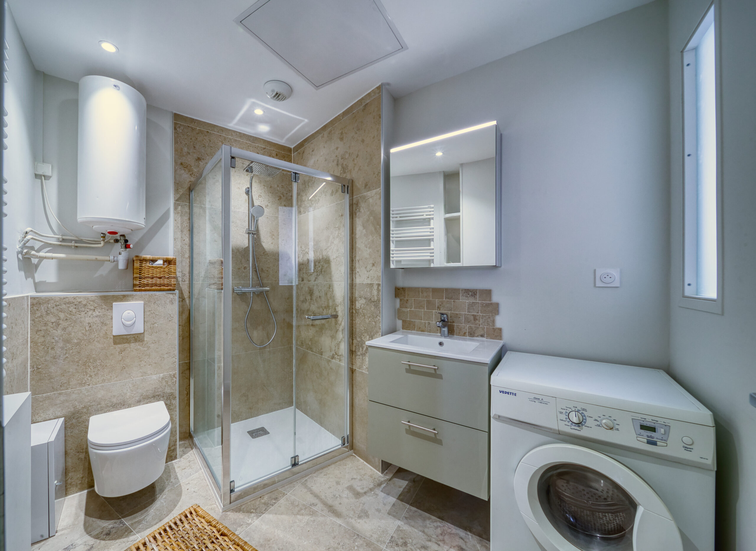 La rénovation de la salle de bain et celle de la cuisine attenante ont été l’occasion d’harmoniser l’ensemble, notamment en choisissant des carrelages au ton pierre et en faisant la réfection des peintures après une reprise complète des murs.