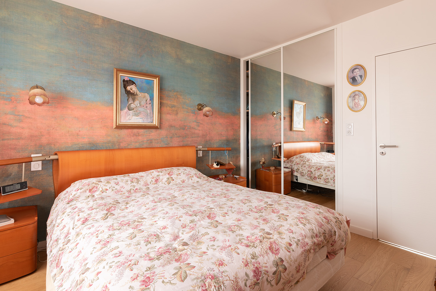 La remise en peinture a été l’occasion d’éclaircir les pièces avec une majorité de murs peints en blanc. Dans la chambre, le mur faisant office de tête de lit bénéficie d’une peinture à effet sablé décliné en trois coloris. Cette touche originale donne du cachet à la pièce.