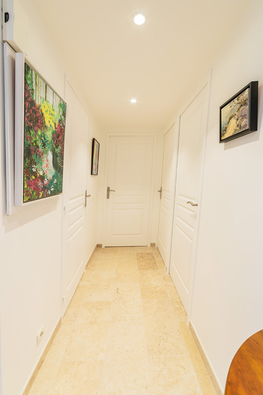A noter : des spots de lumière ont été intégrés au plafond du couloir et à celui de l’espace cuisine pour éclairer en toute discrétion.