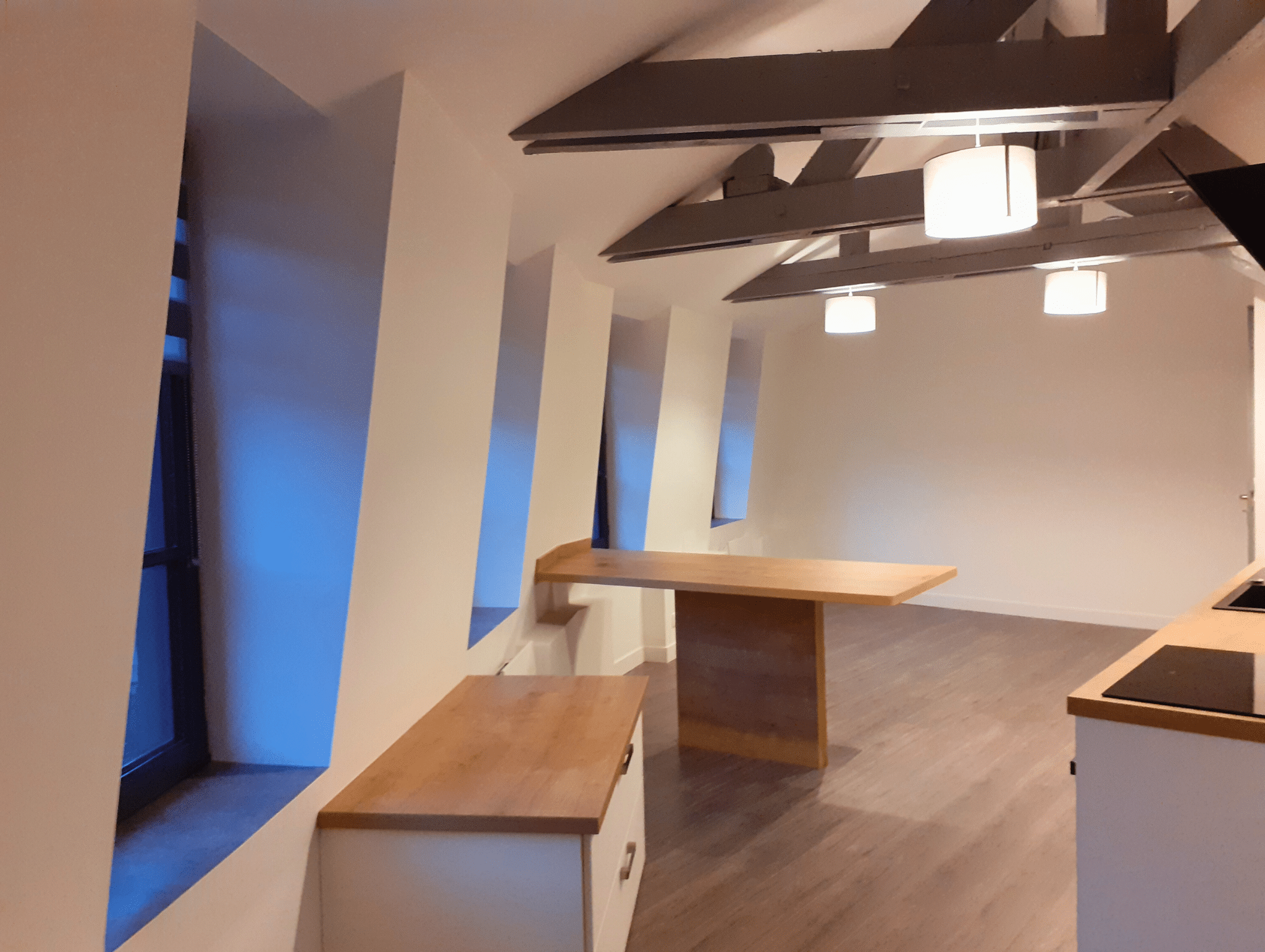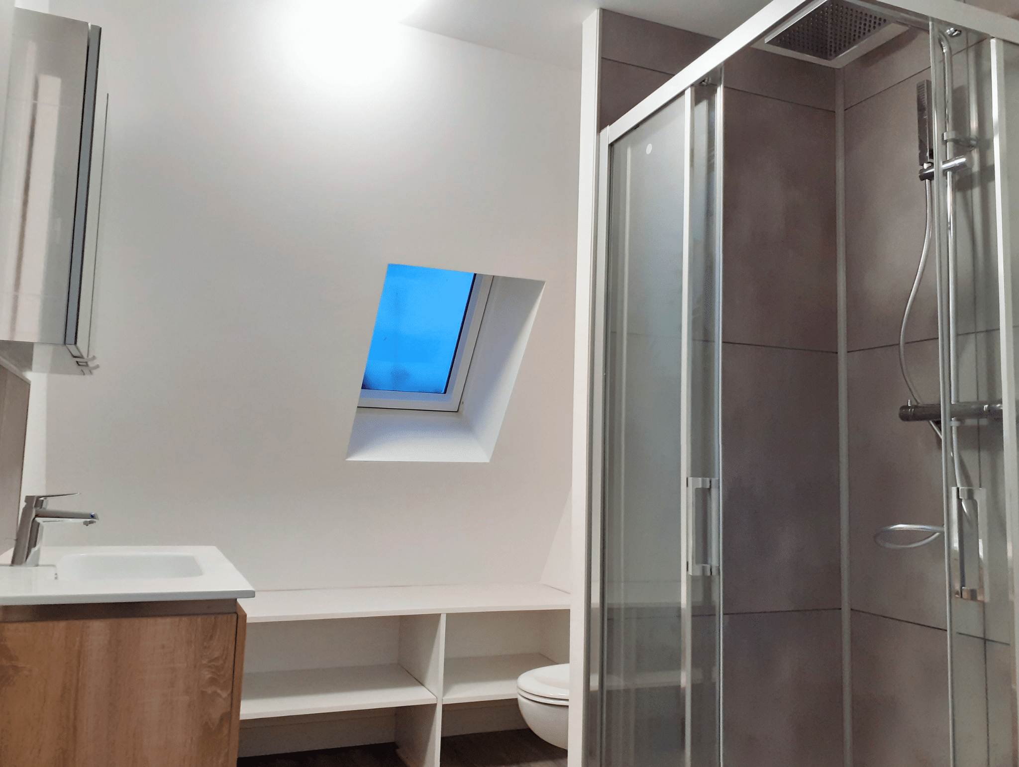 Soutenu par un financement ANAH, le projet orienté vers la location longue durée, portait sur deux logements : un appartement de 65 m² au premier étage et un second de 40 m² au deuxième. Nous avons veillé à respecter un budget maîtrisé, fidèle à une logique d’investissement rentable, tout en garantissant la qualité et la pérennité des aménagements réalisés.