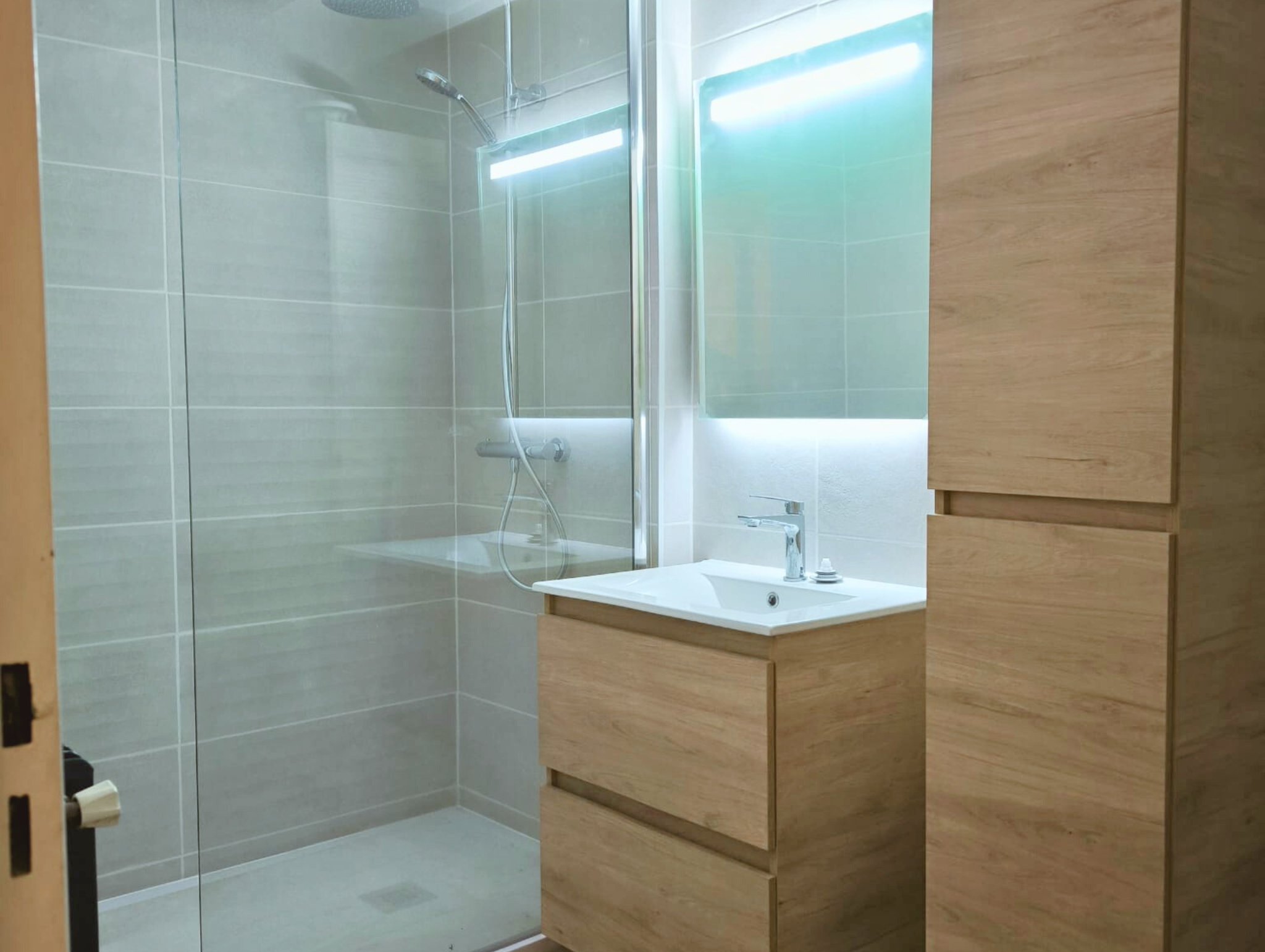 Dans la salle de bain, l’aménagement a été optimisé grâce au remplacement de la baignoire par une douche à l’italienne, beaucoup plus pratique. Le meuble-vasque a également été changé pour un modèle plus contemporain. Pour les finitions, du carrelage a été posé au sol et de la faïence sur les murs. Comme dans la cuisine, l’électricité a fait l’objet d’une adaptation aux besoins et d’une mise aux normes.