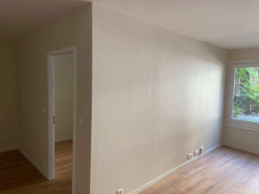 Pour ce projet de rénovation intérieure, le plancher a entièrement été repris. Une fois déposé, un nouveau revêtement de sol a été installé dans le salon et la chambre de cet appartement d’environ 40m².