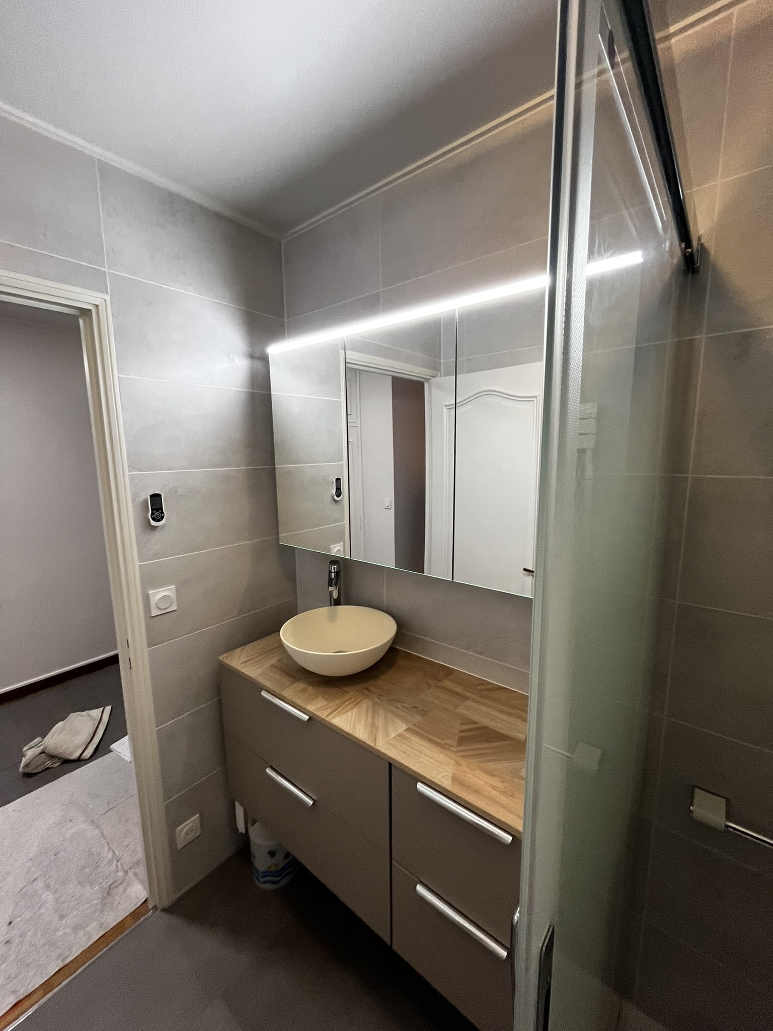 L’ensemble, baigné par la lumière d’un grand miroir LED, transforme une salle de bains autrefois exiguë en un espace moderne, fluide et parfaitement adapté aux besoins du quotidien des clients.
