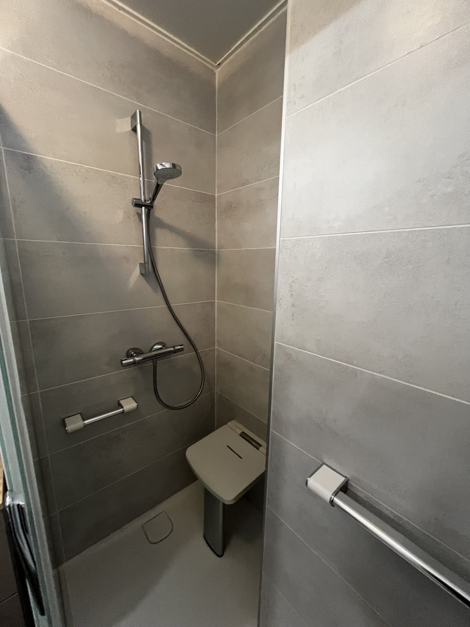 L’accessibilité est désormais au cœur de la pièce avec une douche spacieuse à receveur extra-plat, équipée de deux barres d’appui ergonomiques et d’un siège rabattable pour un confort sécurisé.