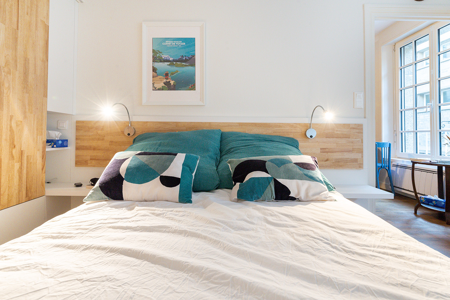 Pour optimiser l’espace, nous avons créé des placards sur mesure dans plusieurs pièces. Dans l’entrée, la chambre et la cuisine, ces nouveaux rangements sont conçus pour maximiser l’utilisation de chaque mètre carré, tout en s’harmonisant avec le parquet en bois clair, créant ainsi une unité visuelle dans l’appartement.