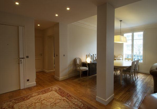 Un impondérable technique (bureau de contrôle) nous a obligés à modifier légèrement le projet de rénovation d’appartement à Courbevoie dans les Hauts-de-Seine, en imposant la création de 2 portiques et 1 poteau de soutènement car les appartements se situent dans un immeuble très ancien (1880) qui le nécessitait.