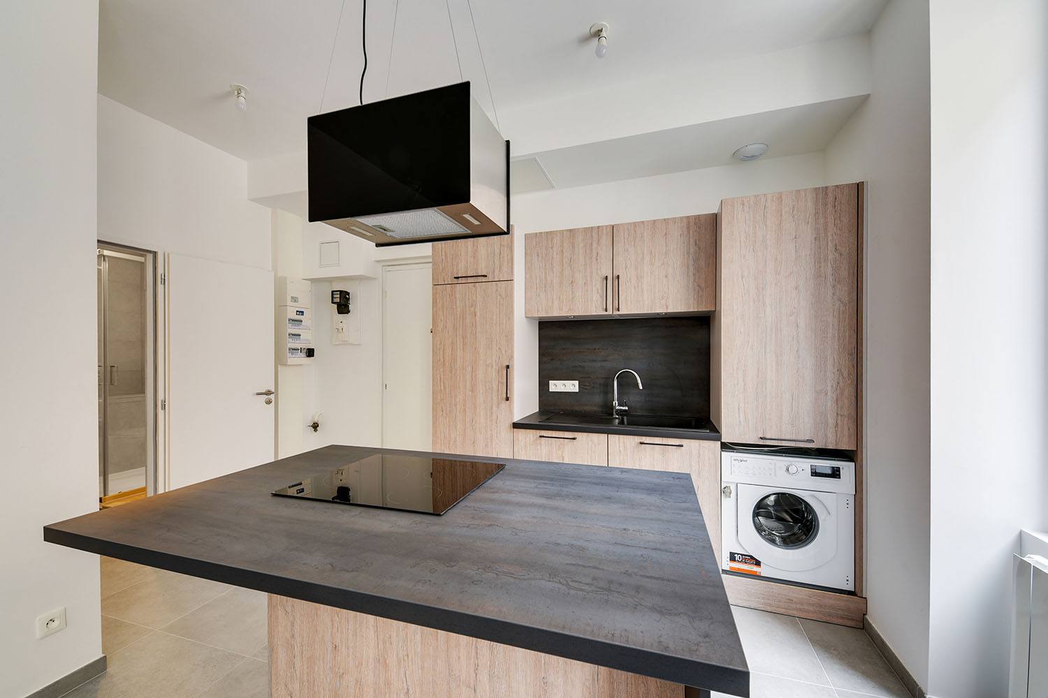 Côté cuisine, un îlot central a été aménagé. Il est suffisamment spacieux pour préparer à manger, cuire sur sa plaque à induction et pour y prendre ses repas à trois voire quatre personnes. Pour optimiser au mieux l’espace, le lave-linge a été encastré sous un meuble de cuisine.