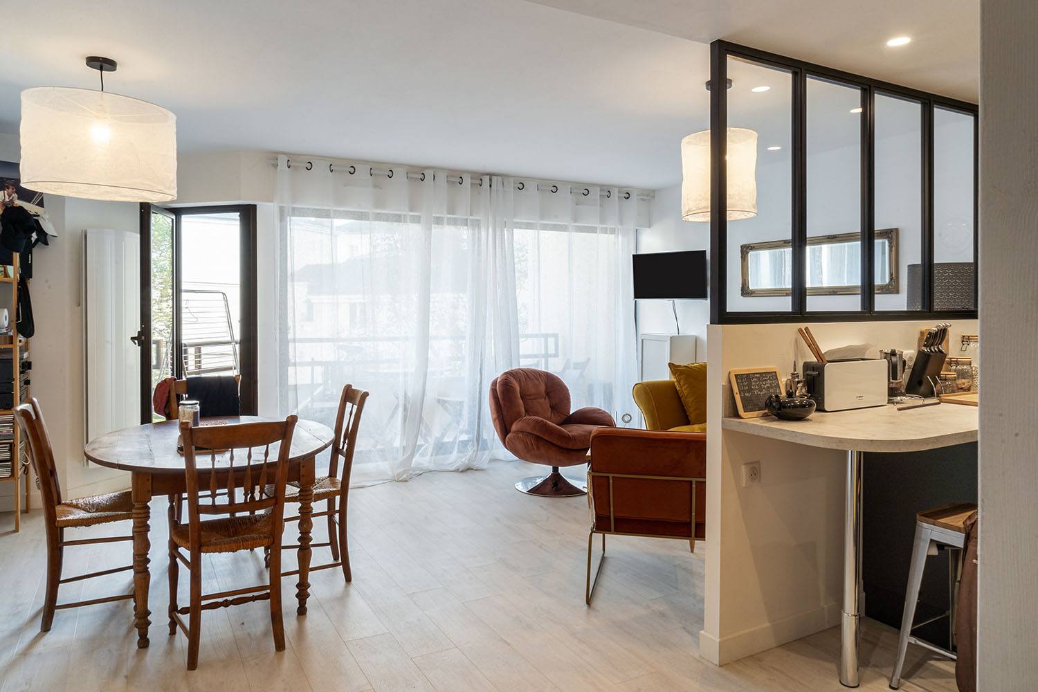 Une verrière a été posée entre la cuisine et le salon, permettant de délimiter les espaces tout en laissant circuler la lumière naturelle.