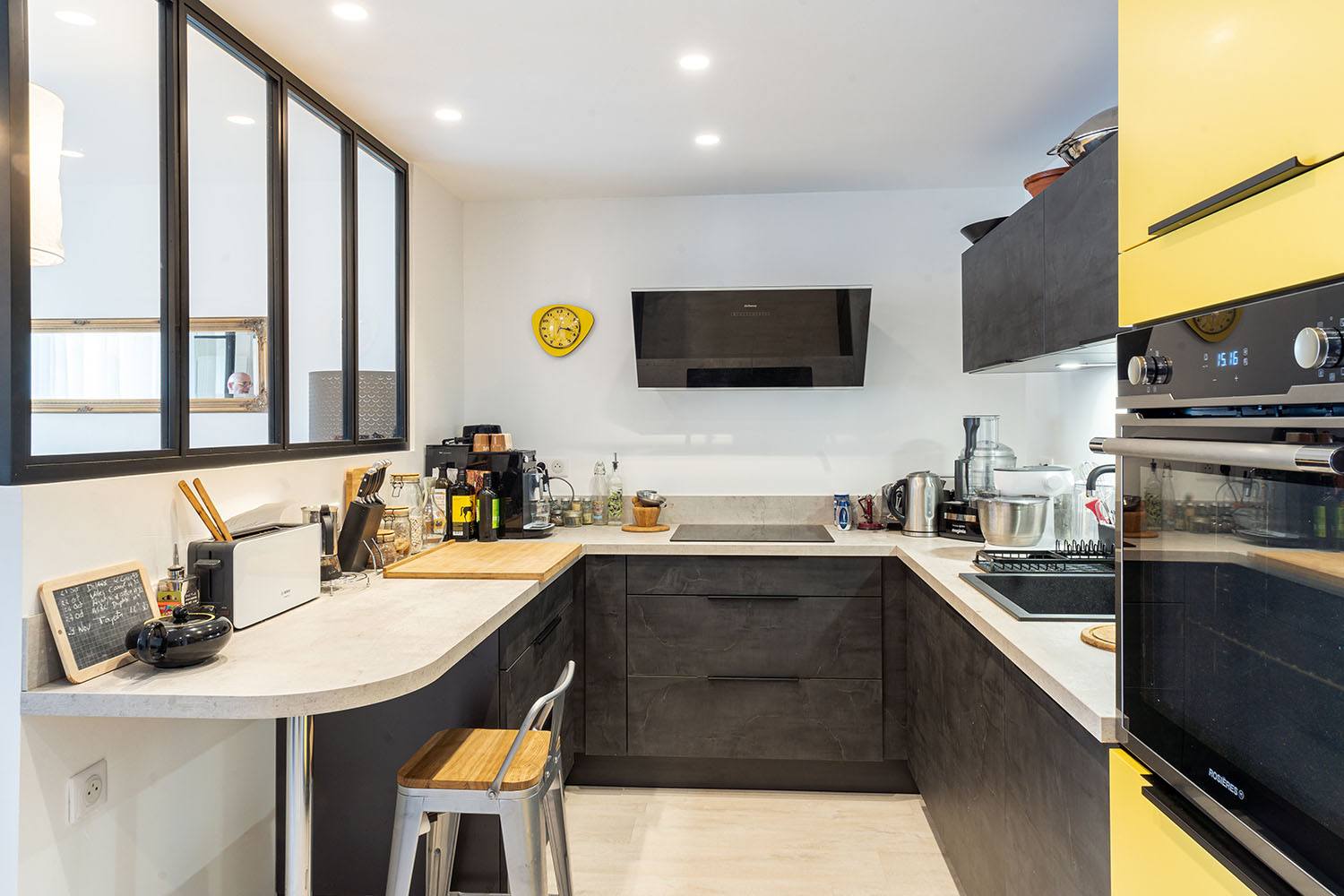 La cuisine, maintenant modernisée, arbore des couleurs noir et jaune, apportant une touche contemporaine et dynamique à l’espace. Un plan de travail en U a été installé, intégrant un petit espace repas.