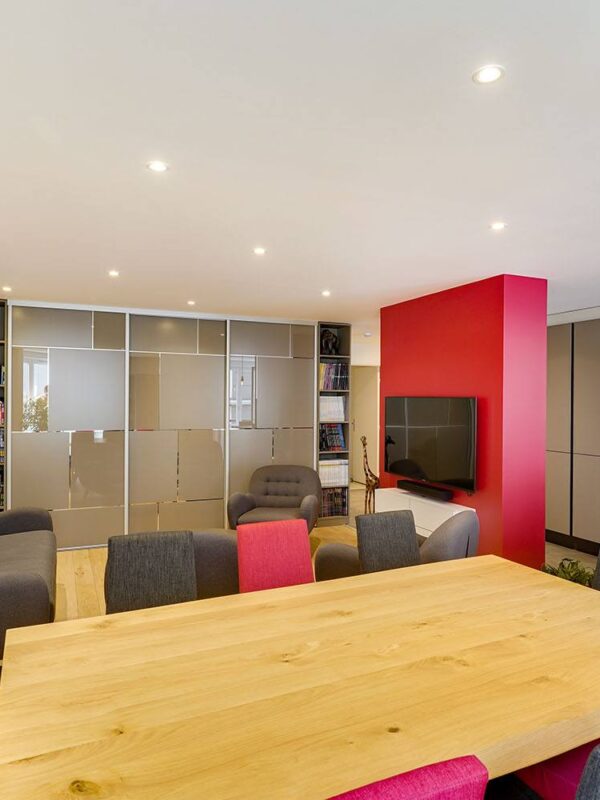 Dans ce projet de rénovation d’intérieur à Lyon, la question de la circulation était primordiale. Nous avons donc procédé à l’abattement de plusieurs cloisons et notamment de celle située entre la cuisine et la salle à manger. En plus de fluidifier la circulation dans cette pièce de vie principale, cela permet de créer un espace plus aéré et plus lumineux.