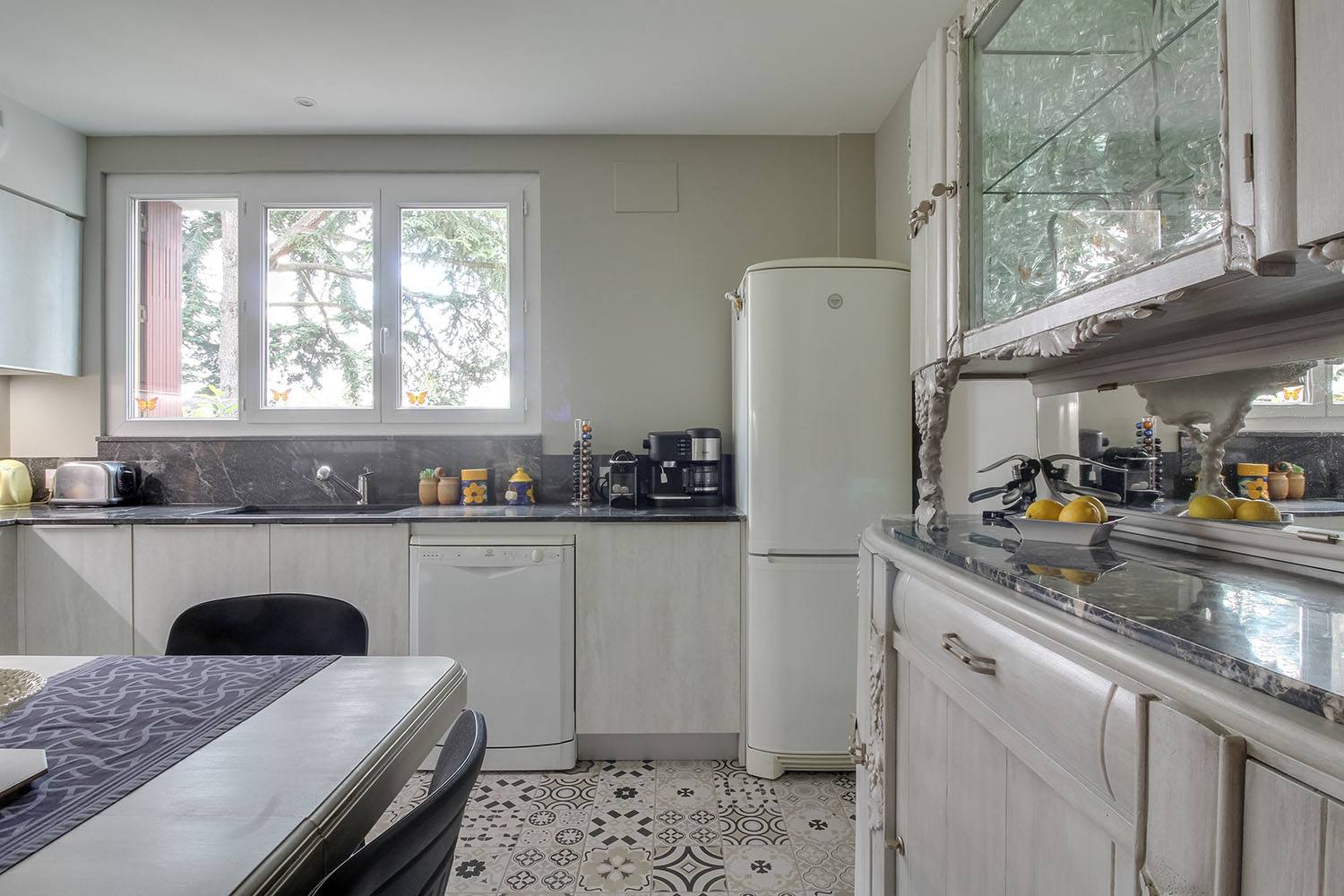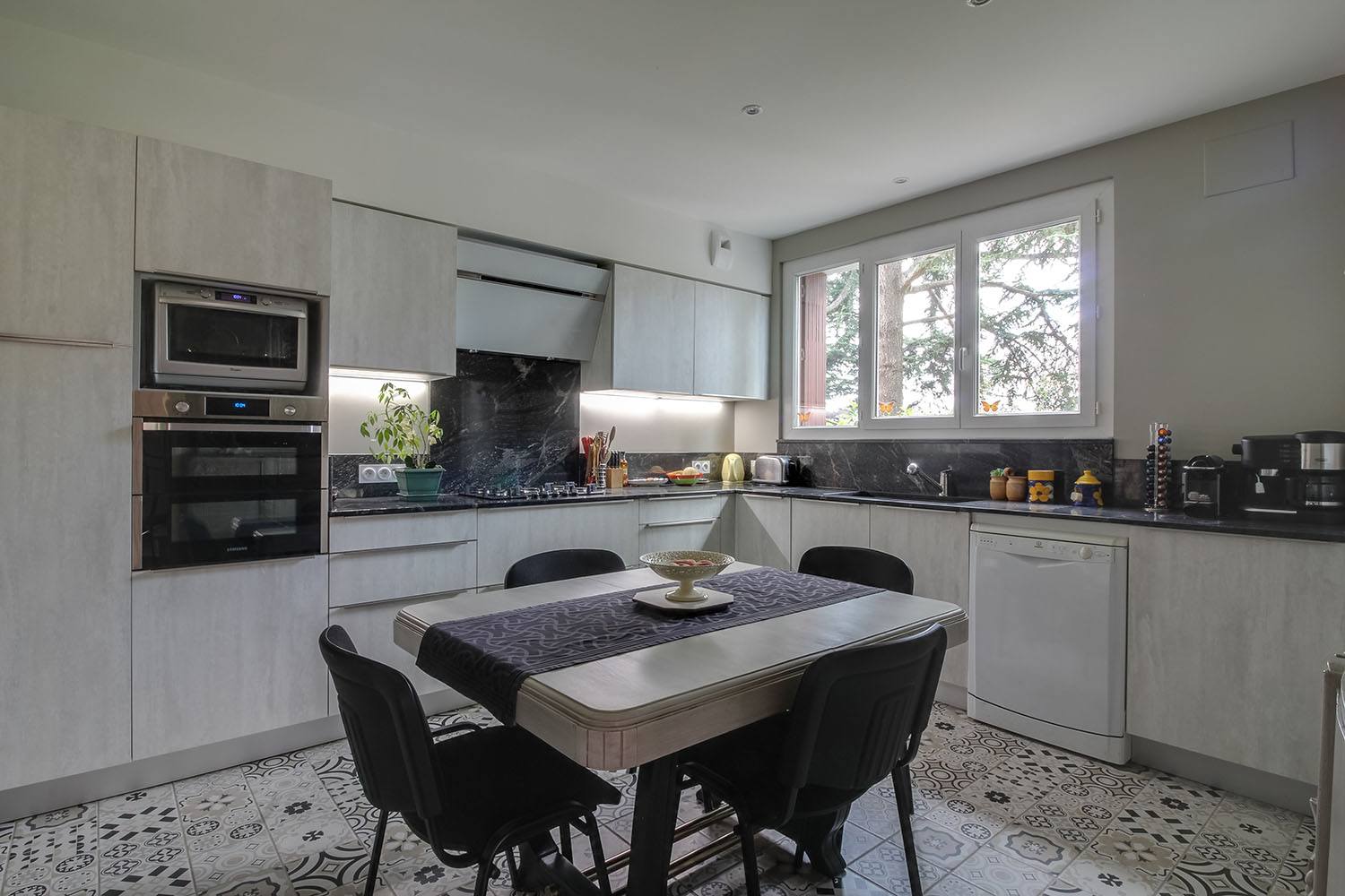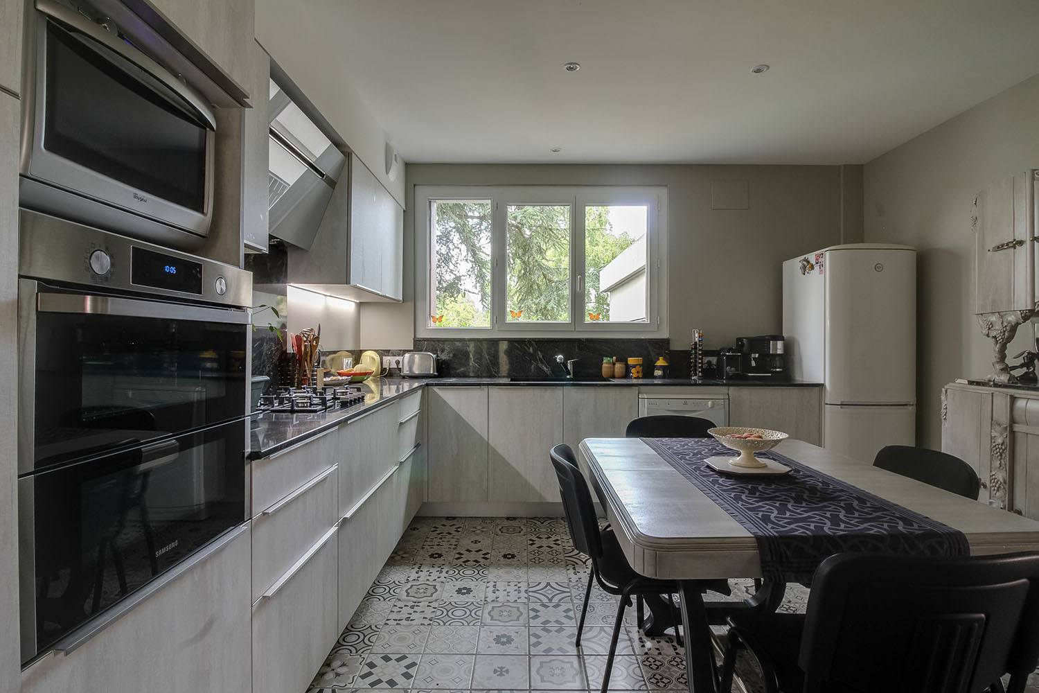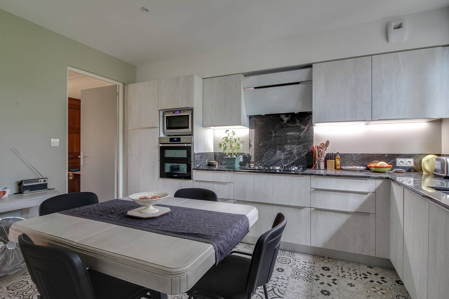 La cuisine a été modernisée avec une nouvelle installation. Les meubles gris effet bois apportent une touche contemporaine, tandis que le plan de travail noir effet marbre ajoute une élégance sophistiquée. Le sol a été revêtu d’un carrelage mosaïque, accentuant le style moderne et apportant une texture agréable.