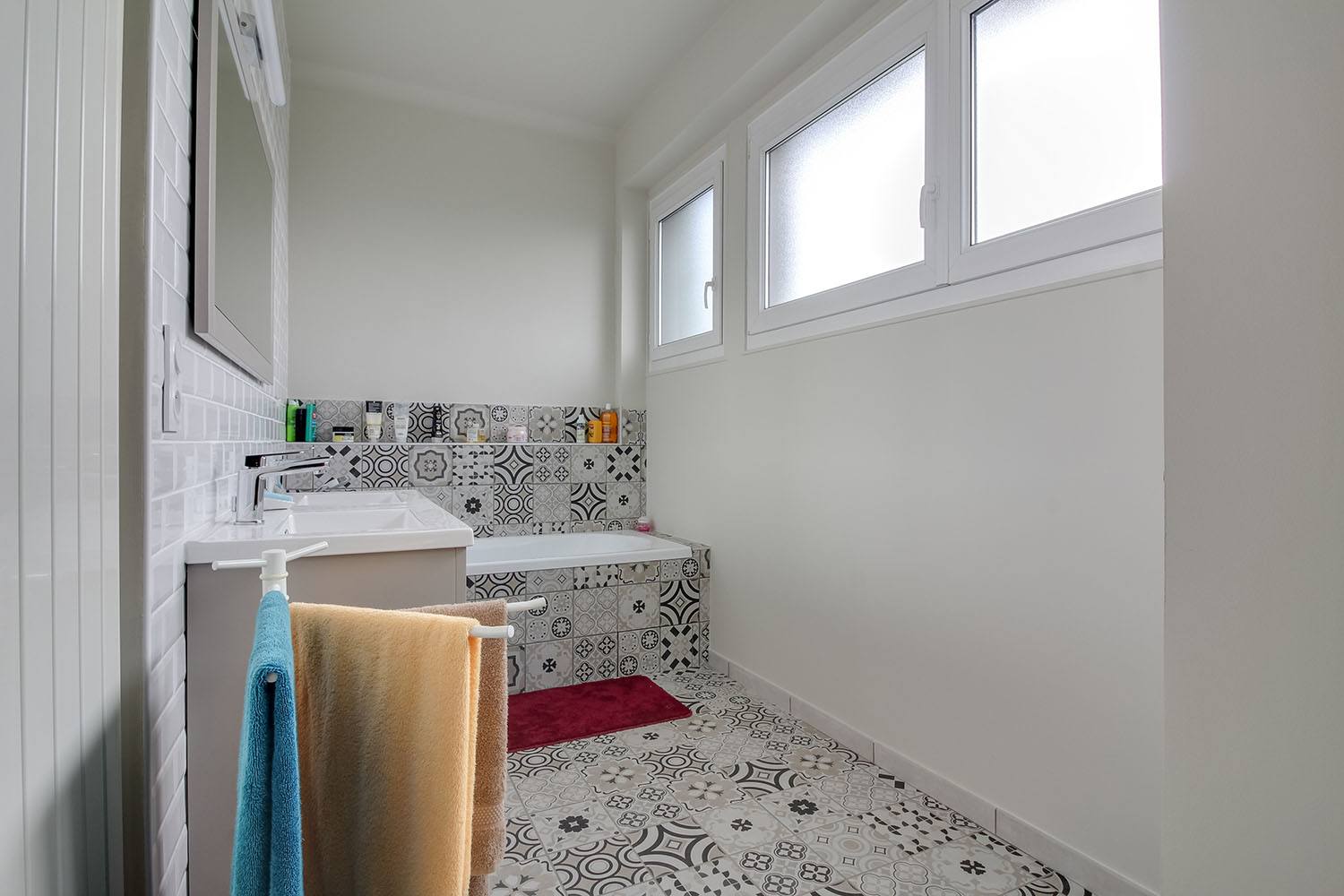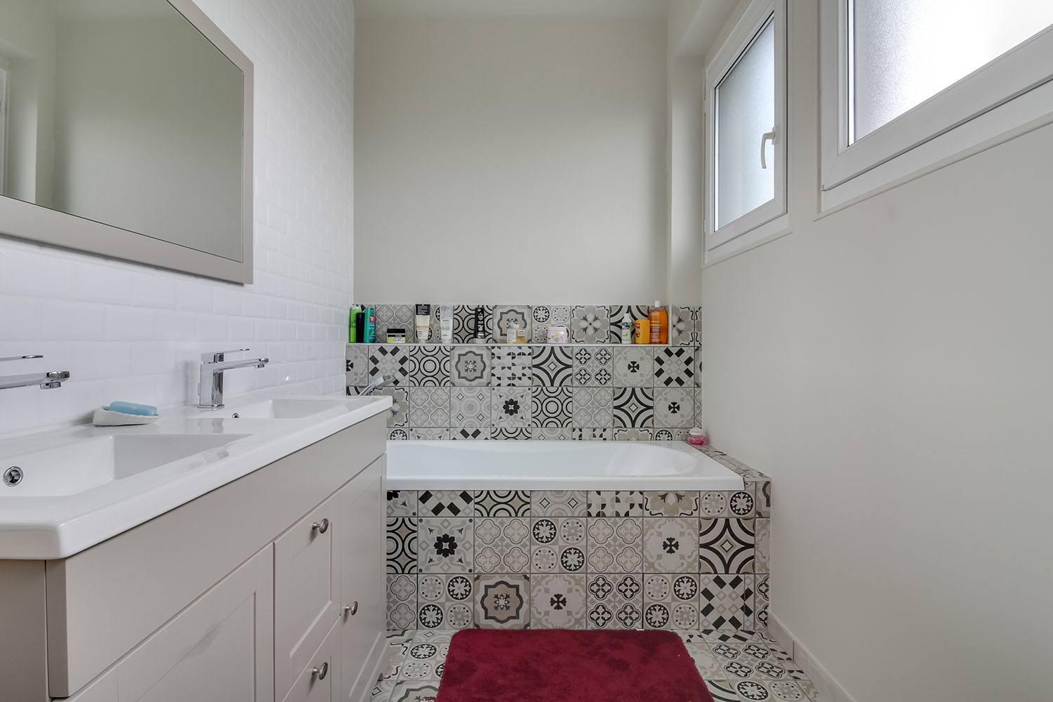 La salle de bain a également été rénovée de manière significative. Le sol a été recouvert du même carrelage mosaïque, tandis que les murs ont été décorés avec de la faïence en carrelage de métro blanc, apportant une touche moderne et épurée. Un nouveau meuble vasque a été installé, alliant fonctionnalité et esthétique.