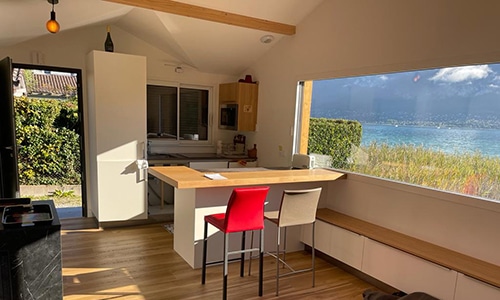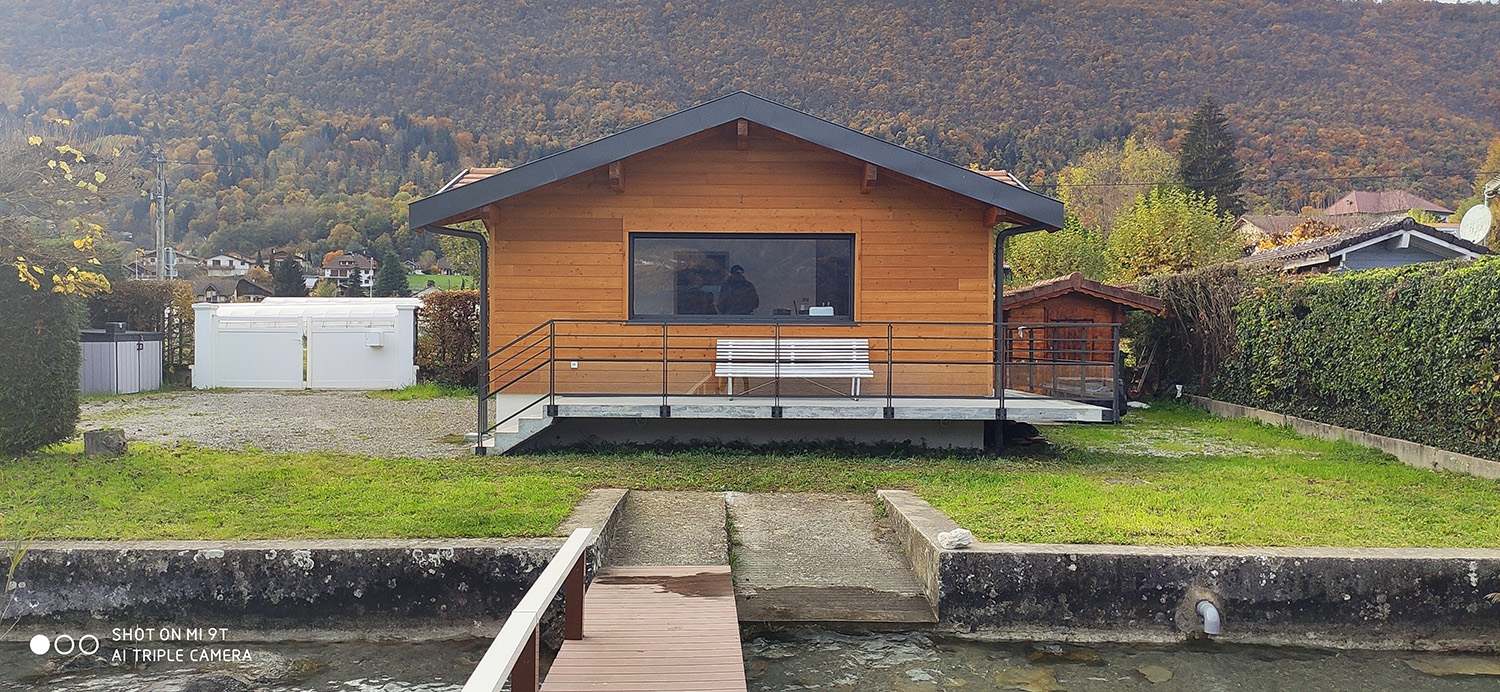Reconstruction d’une maison proche d’Annecy : l’ancienne cabane de pêcheur a laissé la place à un chalet aménagé en future résidence principale.