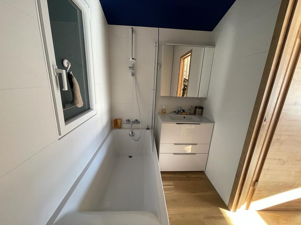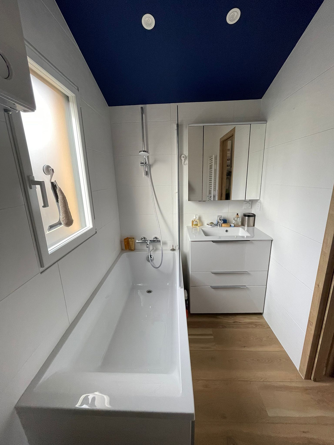 Dans la chambre comme dans la salle de bain, le duo blanc et bleu marine habille les murs et le plafond, faisant entrer un peu de l’esprit du lac dans l’habitation.