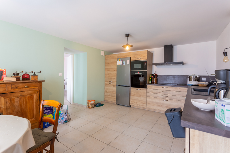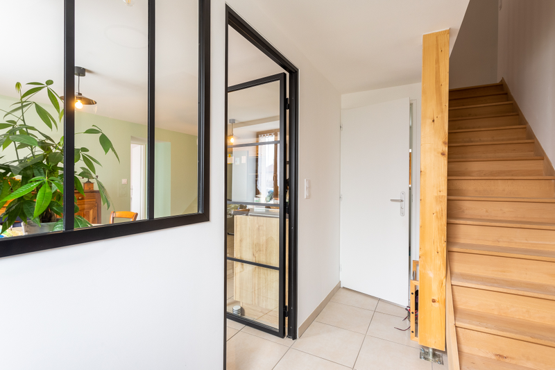 Côté revêtement de sol, tout le rez-de-chaussée a été recouvert de carrelage de grandes dalles carrés à la teinte claire.