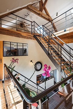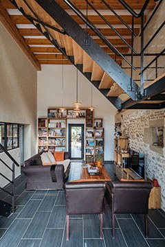 Rénover une maison ancienne, initialement dédié à un usage agricole, en une vaste maison d’habitation, repose sur la coexistence des matériaux d’origine, comme la pierre, préservant la rusticité du lieu, et d’autres, plus contemporains, comme le bois ou le métal.