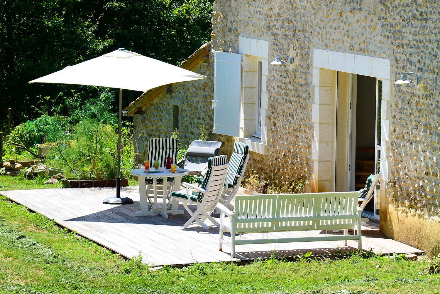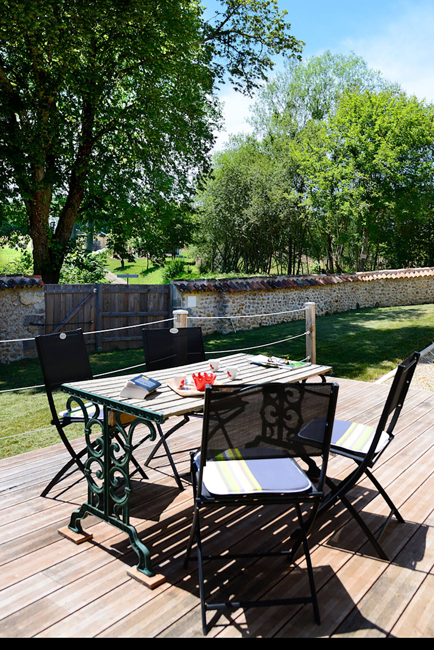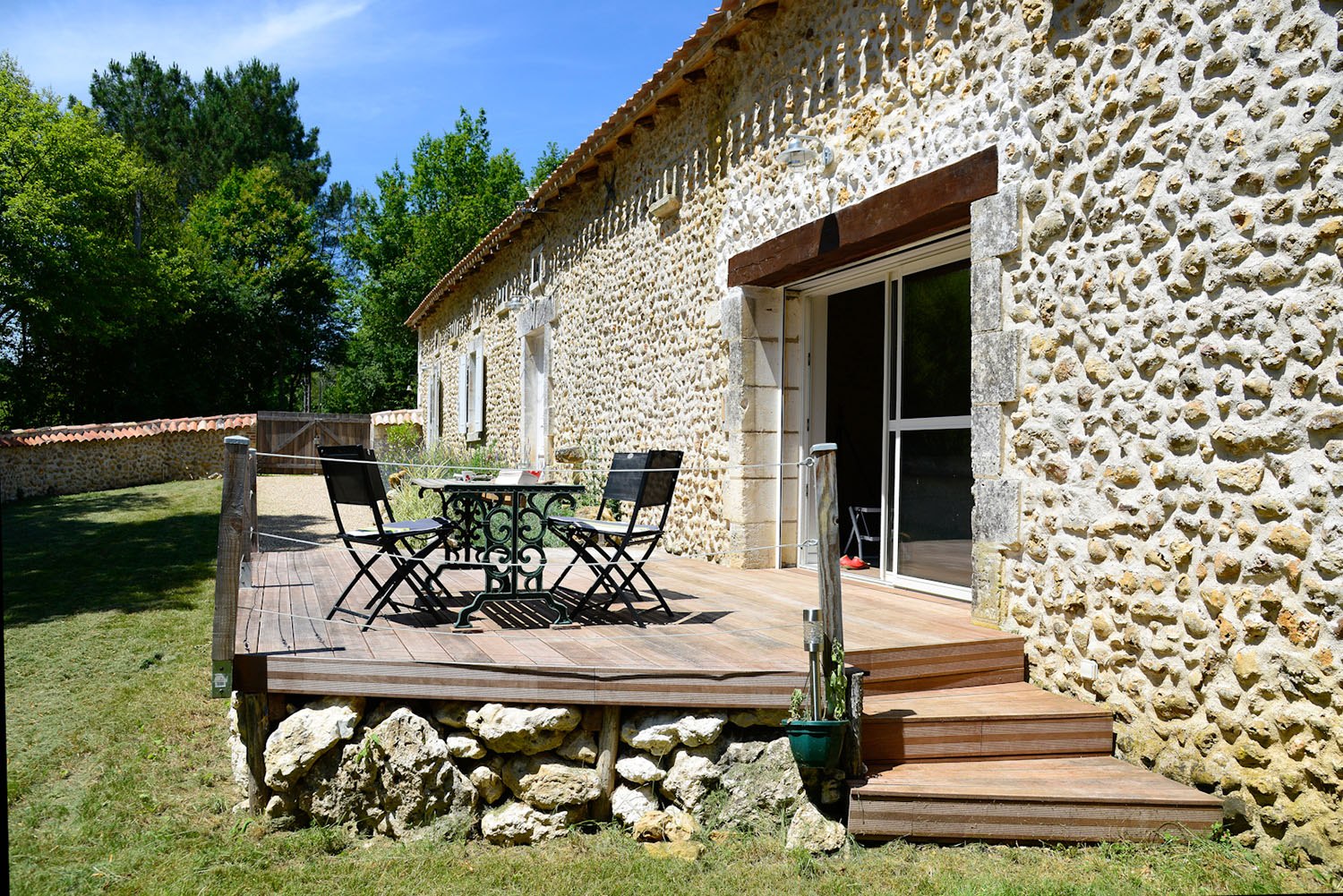 Enfin, deux baies vitrées accessibles depuis l’espace de vie et ouvrant sur la cour ont été conçues afin de laisser entrer la lumière, valorisées par deux terrasses en bois, les prolongeant. Un cadre de vie idéal permettant à toute la famille de profiter au mieux de notre cher soleil périgourdin !