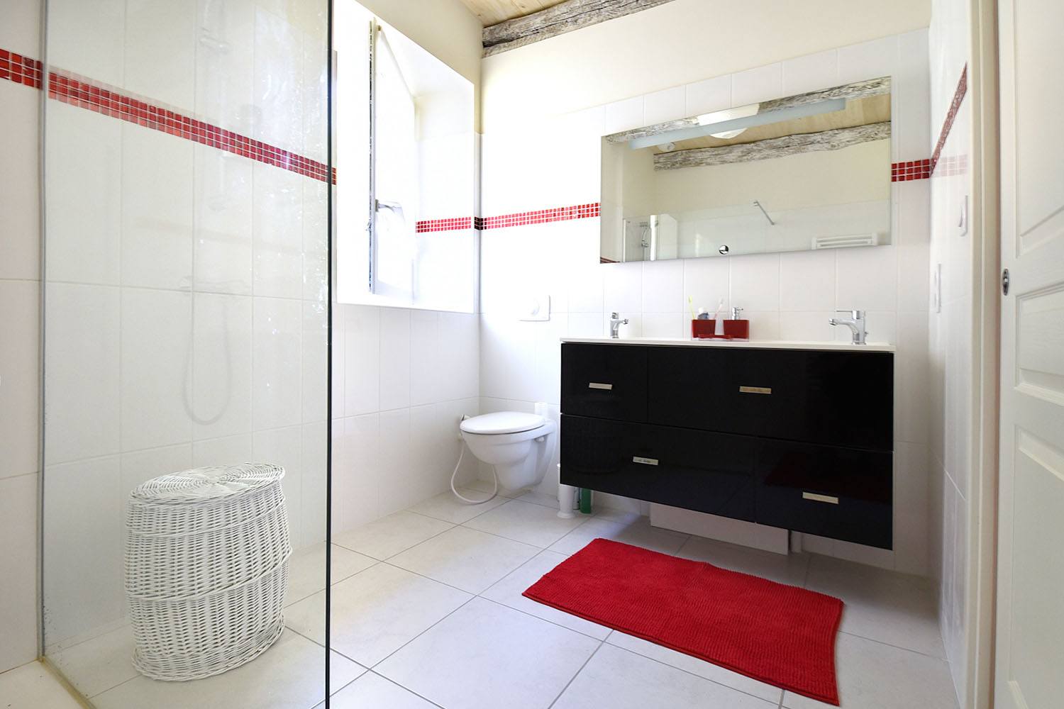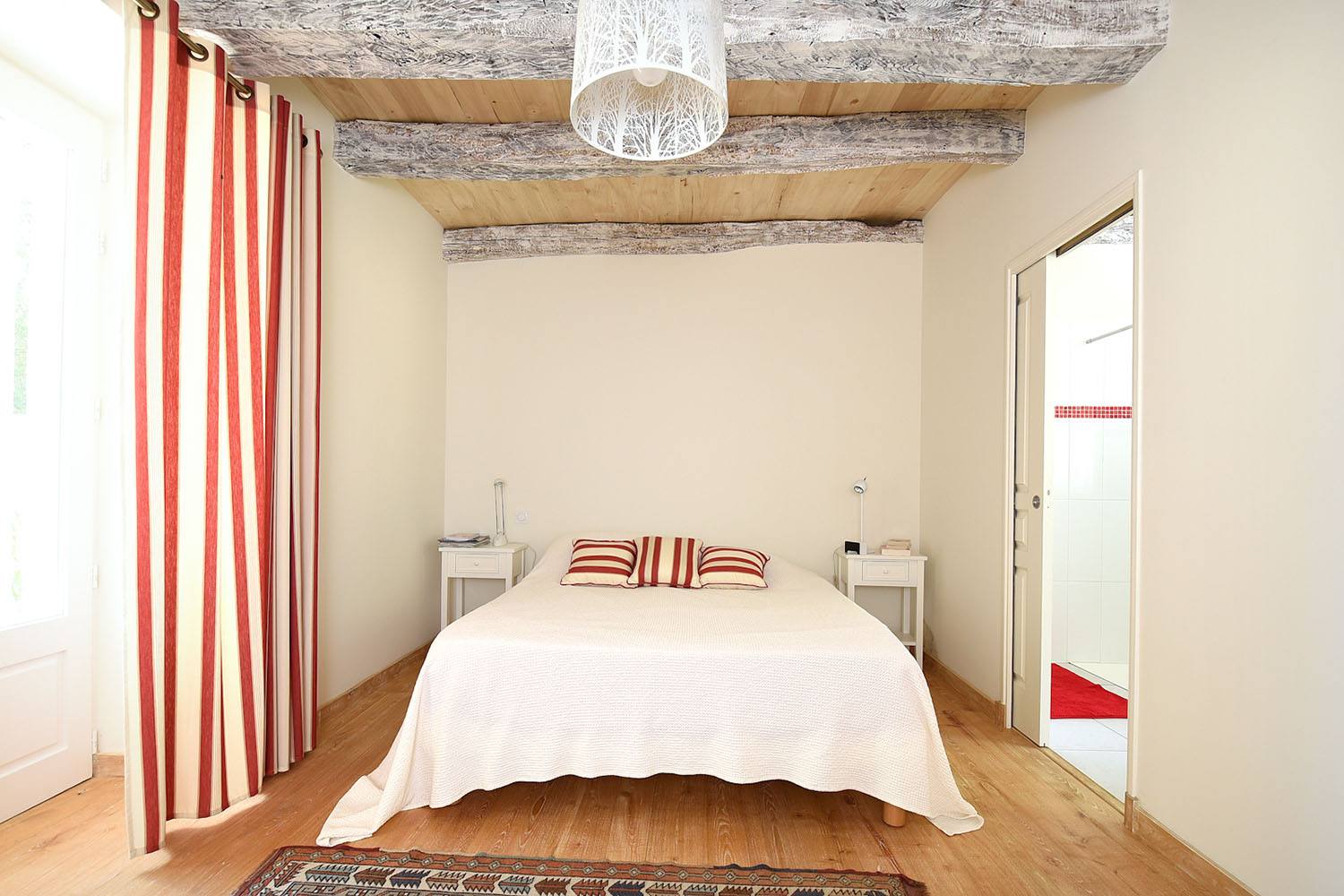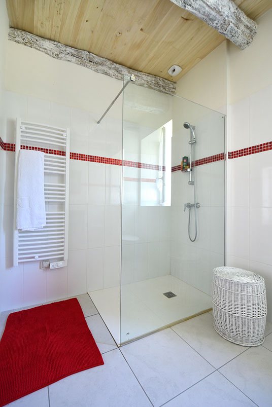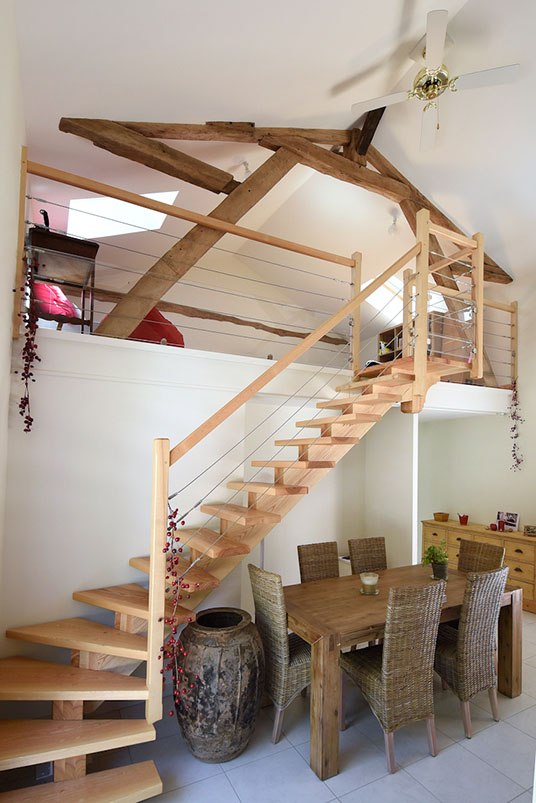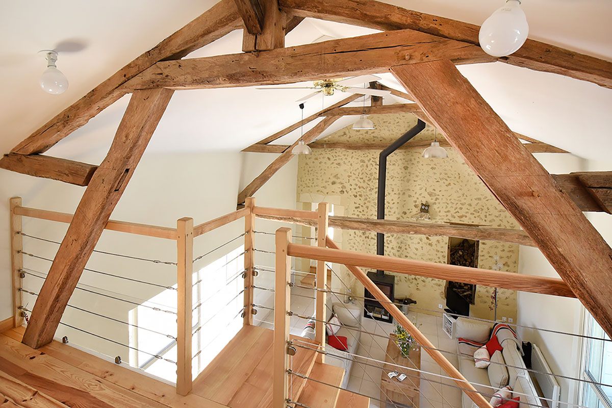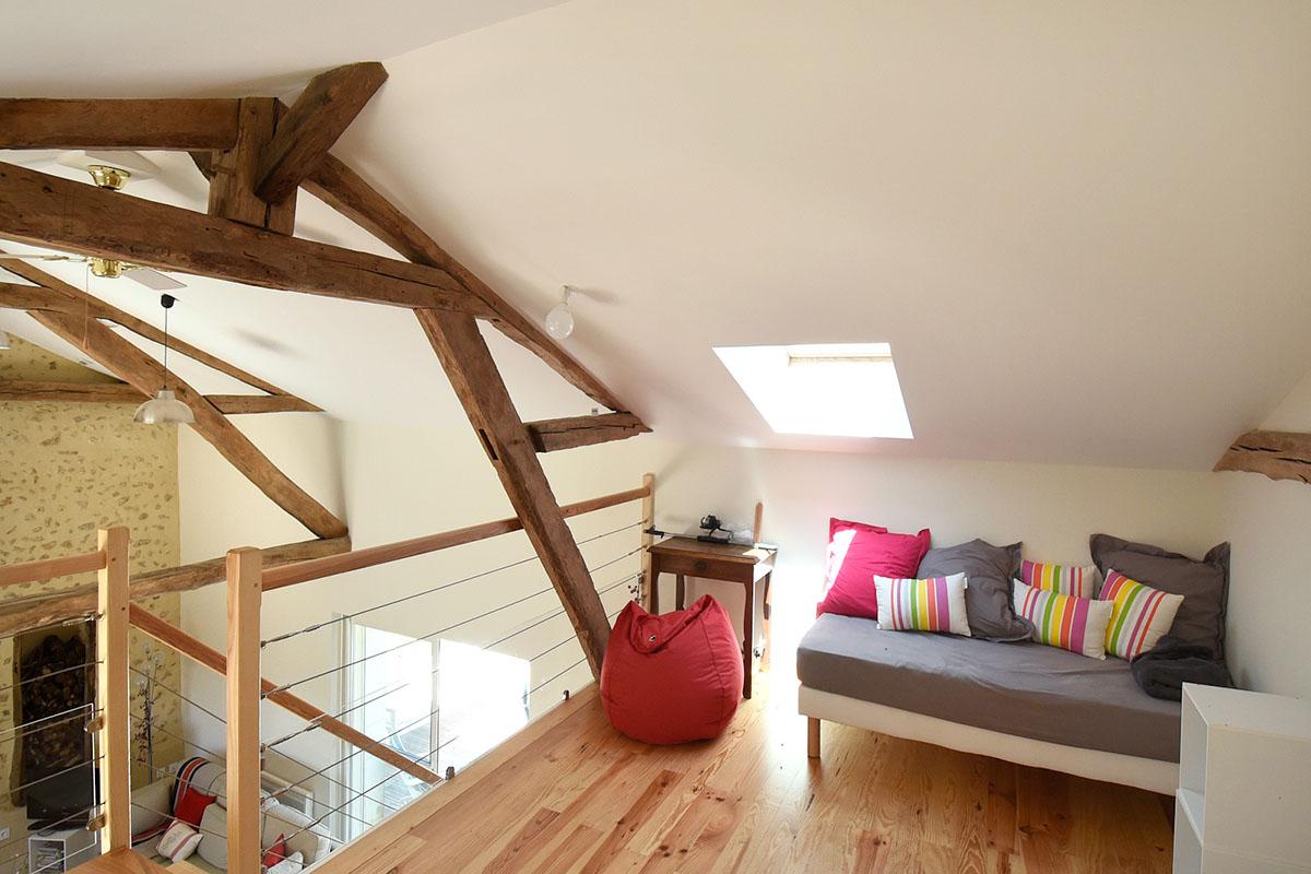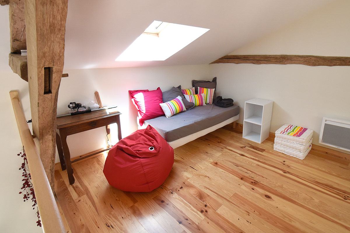 Dans le cadre de cette rénovation en Dordogne, tous les éléments de boiseries ont, soit été conservés, soit créés par un ébéniste local, en bois de châtaigner, essence reine en ce pays périgourdin ! Ce dernier a ainsi créé un magnifique escalier intérieur, permettant d’accéder à la partie duplex, ainsi que les parquets des trois chambres du premier bâtiment.