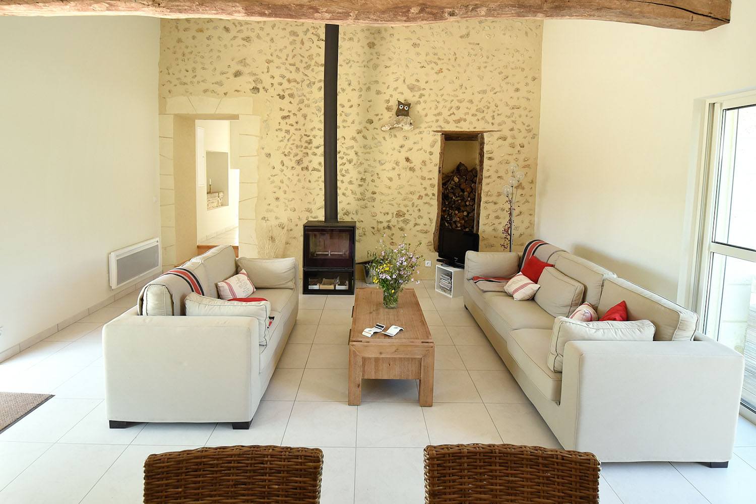 Dans le salon-séjour, des percements entre l’ancienne habitation et la grange ont été réalisés pour faire communiquer les deux espaces. Et, pour palier la grande hauteur sous plafond, une VMC double flux, permettant de propulser la chaleur émise par le poêle à bois situé dans le salon, a également été installée. Les importants travaux de rénovation énergétique (isolation et menuiserie) mis en œuvre sur l’ensemble de ce chantier permettent aujourd’hui à mes clients d’évoluer dans une demeure confortable et respectant les critères imposés par l’actuelle réglementation thermique. Un élément central pour maîtriser sa facture énergétique !