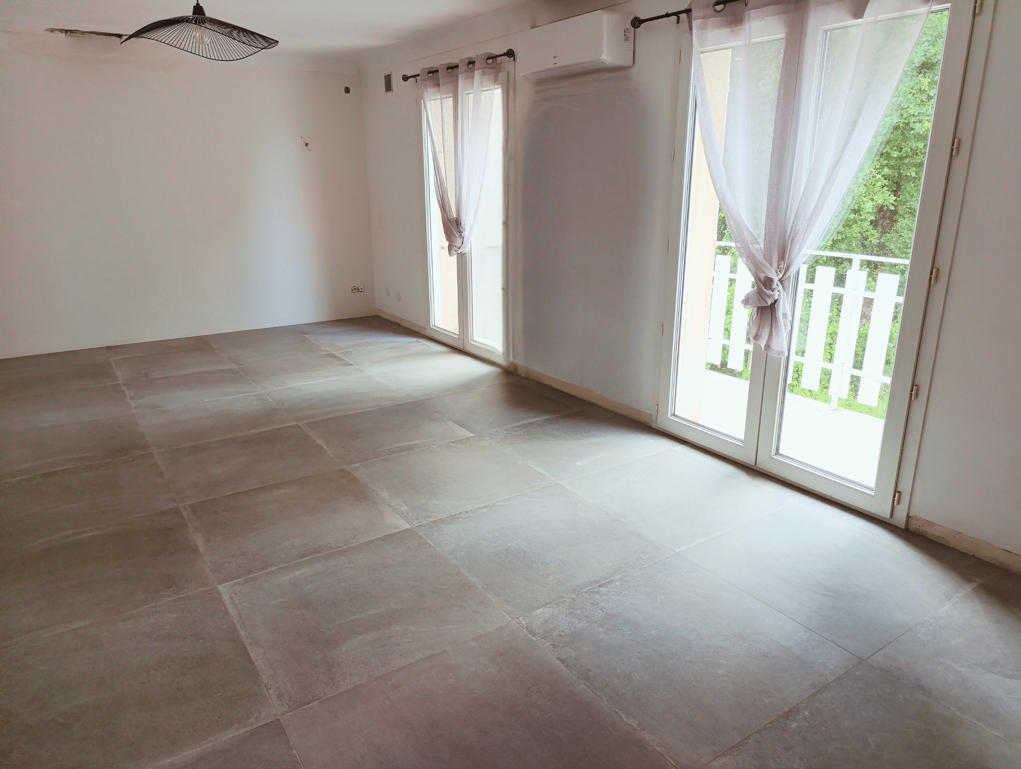 Nous avons posé un nouveau carrelage sur l’ensemble de la pièce, apportant un sol uniforme et moderne. Les murs ont été repris avec un enduit avant la mise en peinture pour un rendu soigné et prêt à décorer.