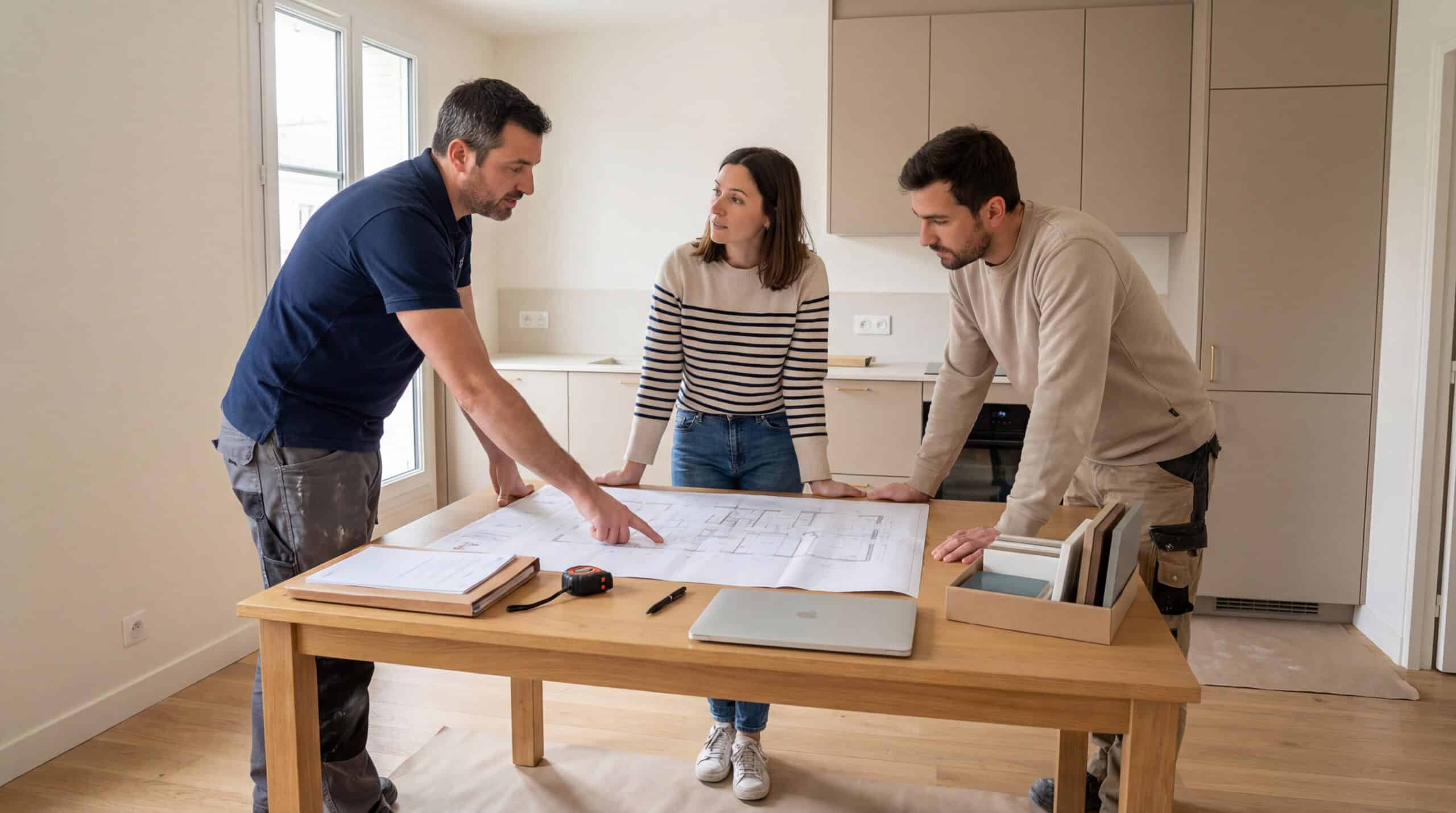 Une rénovation de cuisine commence par un diagnostic précis, puis la dépose des anciens éléments.