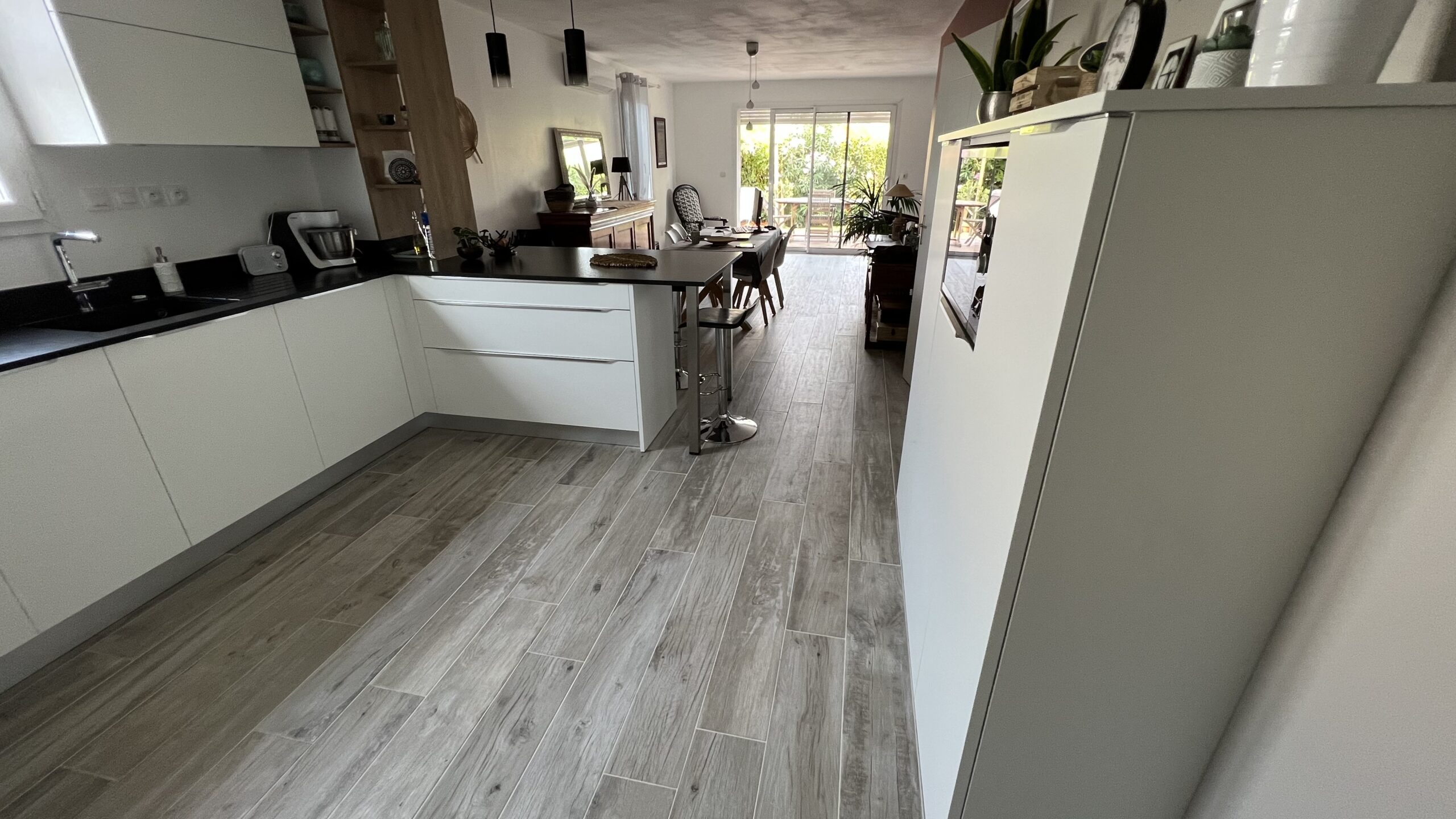 Nous avons fait construire cette maison en 2010, dans un lotissement au sud de Toulouse. Tout le carrelage du rez-de-chaussée a fissuré en raison de la technique de pose scellée effectuée à l’époque de la construction. Notre objectif était donc de remplacer le carrelage par un modèle plus moderne, en imitation parquet. Souhaitant tirer parti de cette situation, nous avons décidé également de rénover notre cuisine et nos toilettes.
