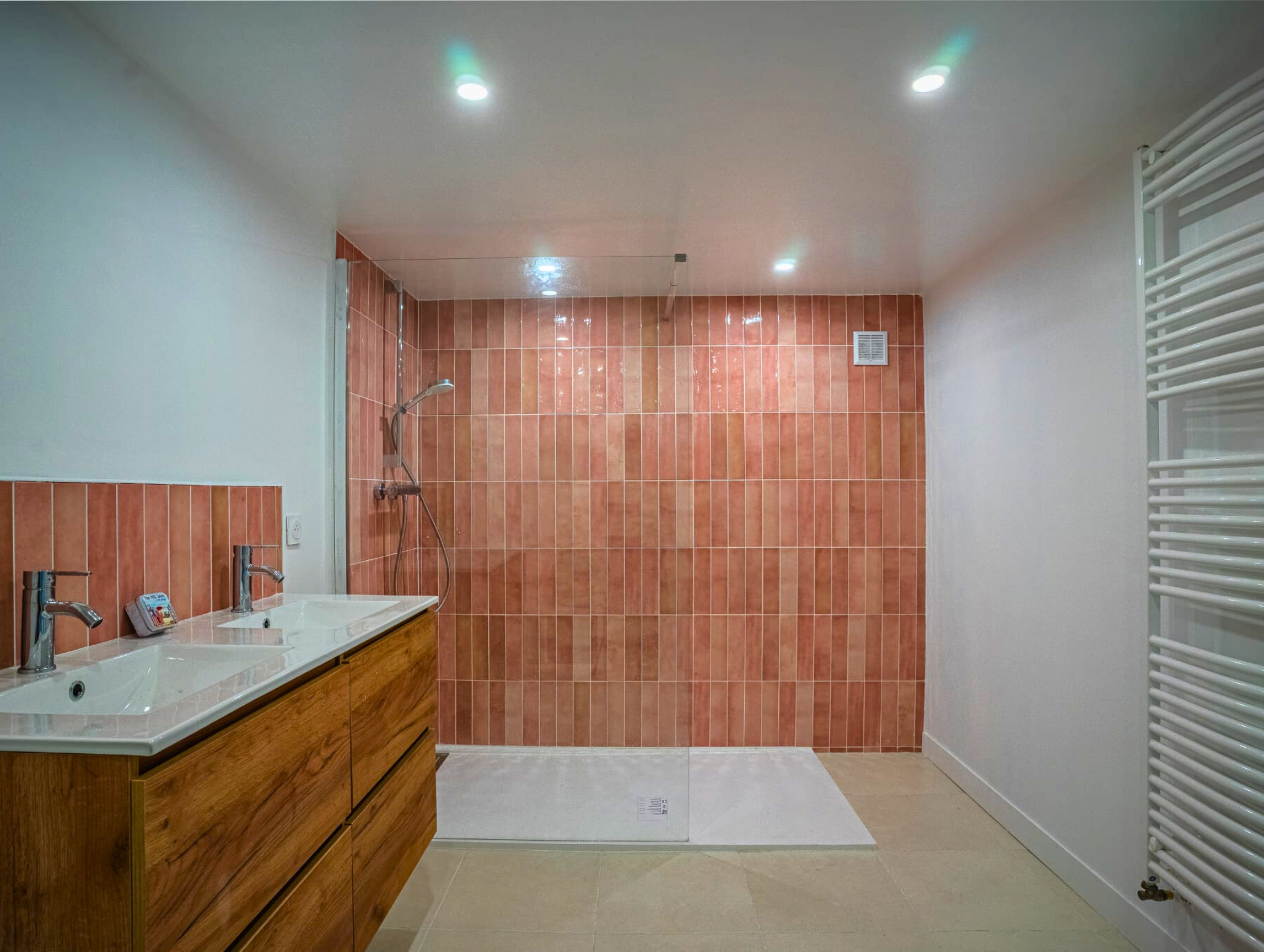 La douche est équipée d’un receveur de douche extra-plat et d’une paroi vitrée. La faïence de couleur terracotta apporte une touche chaleureuse à la pièce. Un grand meuble sous-vasque a été posé. Il est en bois texturé avec plusieurs tiroirs offrant un large espace de rangement. Le meuble est surmonté d’une double vasque blanche et d’une frise avec la même faïence que la douche. Un sèche-serviettes a également été installé.