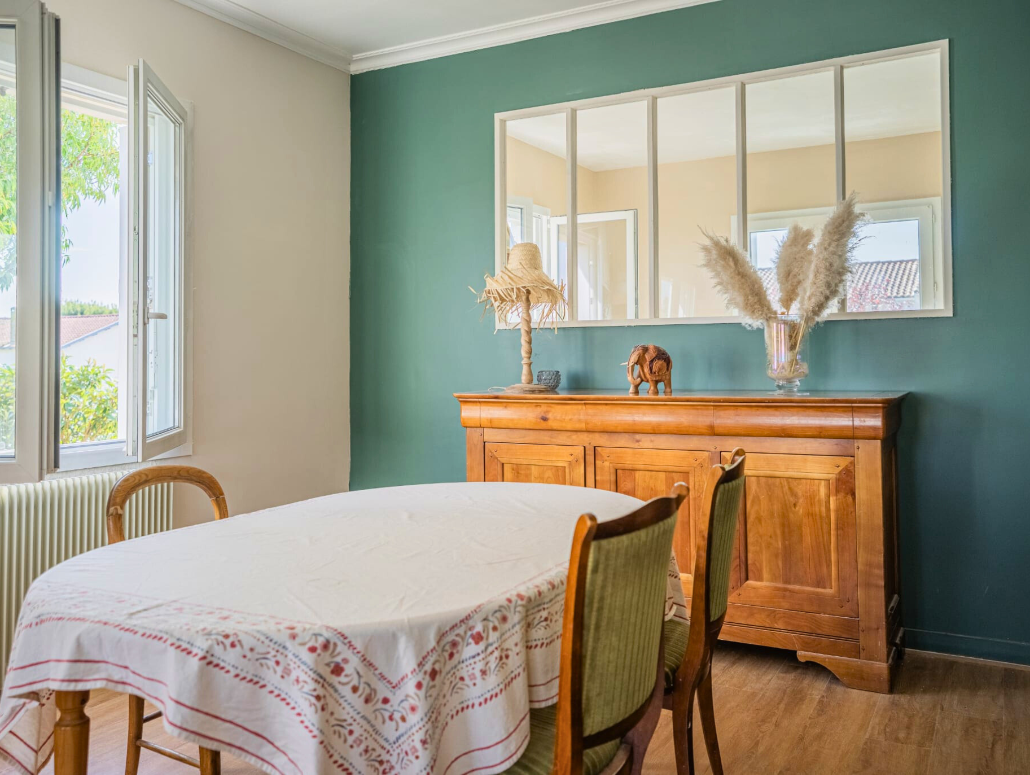 Alors que dans la cuisine, il ne s’agissait que de changer le plan de travail, le salon a bénéficié d’une rénovation complète pour le rendre moderne et lumineux. Le papier peint a laissé la place à un duo de peinture, blanc et vert sauge. Au sol, un PVC imitation parquet a été posé.