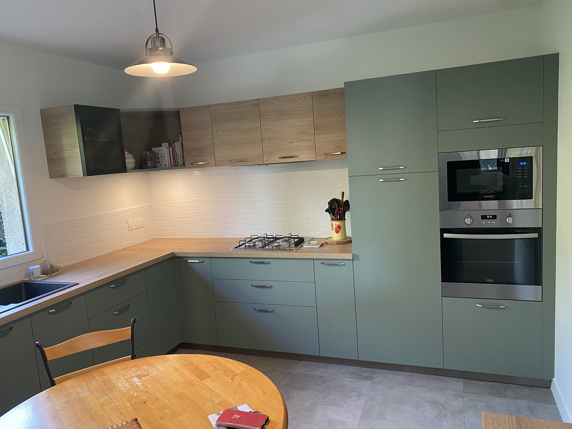 Pour commencer, la cuisine a complètement été rénovée. En effet, nous avons déposé le carrelage et la faïence ainsi que les meubles de l’ancienne cuisine. Ensuite, une nouvelle cuisine plus moderne a été installée, avec un nouveau carrelage et une nouvelle faïence, et les peintures ont été refaites. Cette cuisine est maintenant plus lumineuse, nos clients ont choisi une couleur tendance : le vert. La pièce est aussi plus fonctionnelle avec un grand plan de travail en bois, de nouveaux rangements, de l’électroménager encastré.