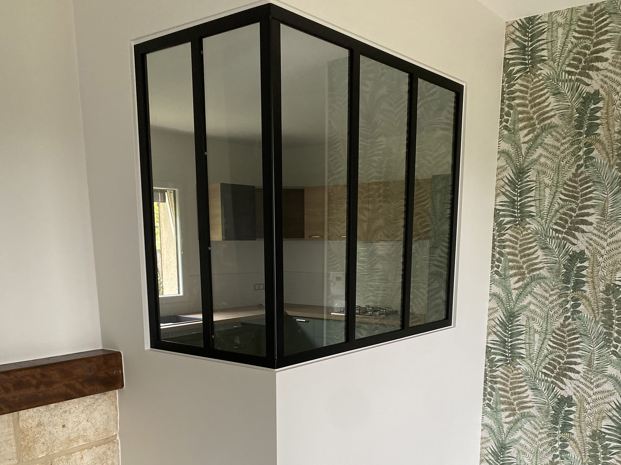 Dans le séjour, nous avons tout détapissé puis posé une nouvelle tapisserie au goût du jour. De plus, une verrière a été installée entre la cuisine et le séjour, offrant ainsi plus de luminosité à la pièce.