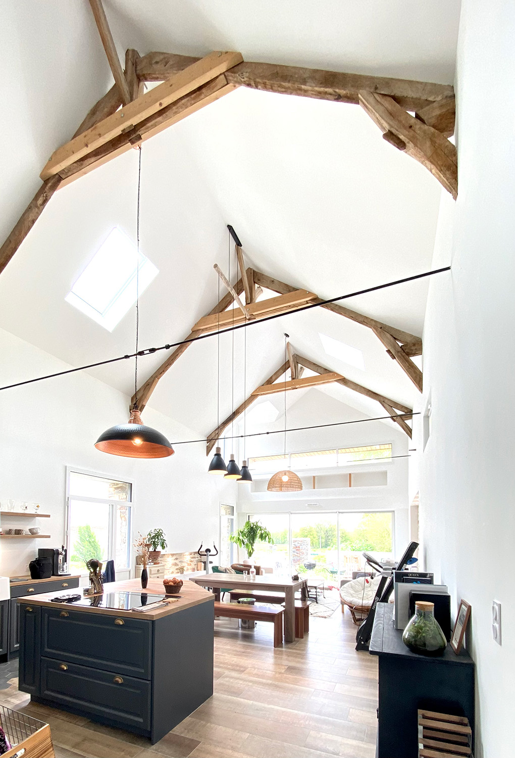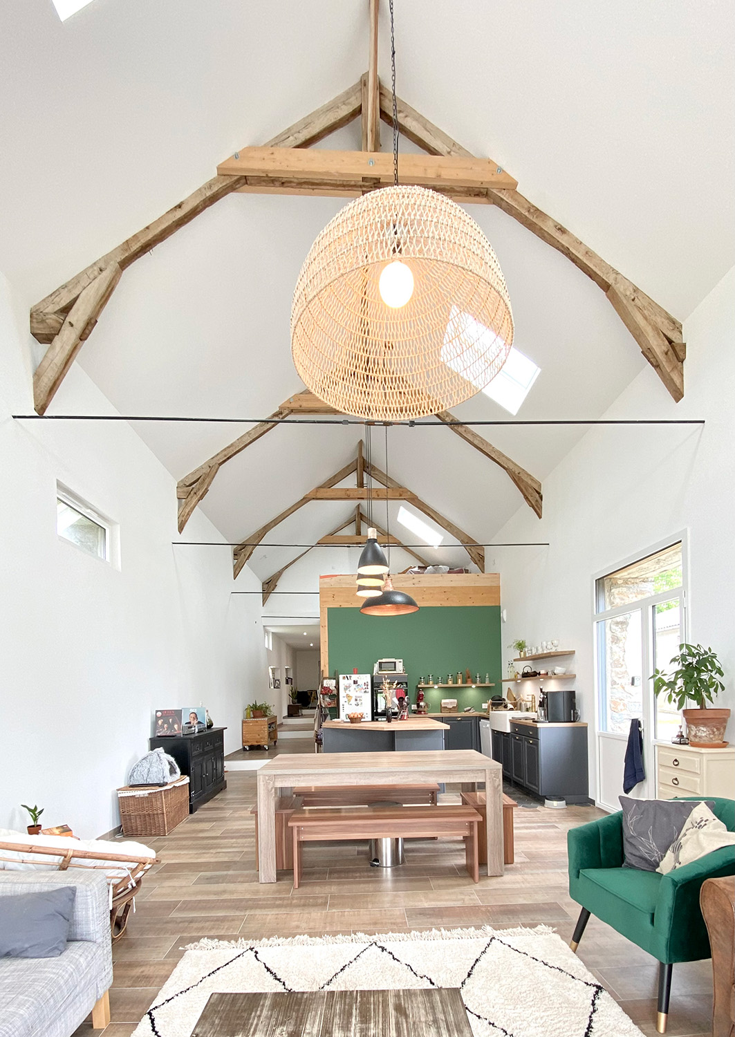 Si la façade principale a été restaurée en valorisant les pierres, une des façades latérales accueille désormais une large baie vitrée surmontée d’un bardage en bois. En intérieur, la charpente visible donne du cachet. Deux fenêtres de toit ont aussi été posées pour que la pièce principale bénéficie d’une généreuse lumière naturelle.