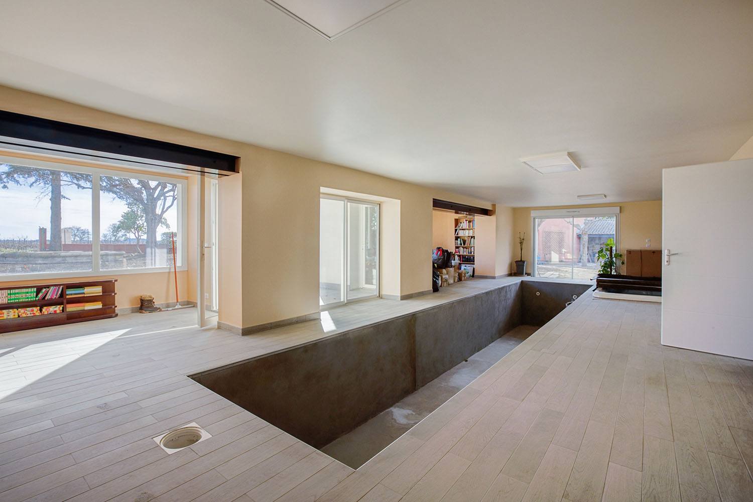 Rénovation d’une ancienne maison près de Béziers, comprenant la création d’un couloir de nage et d’un spa en rez-de-chaussée.