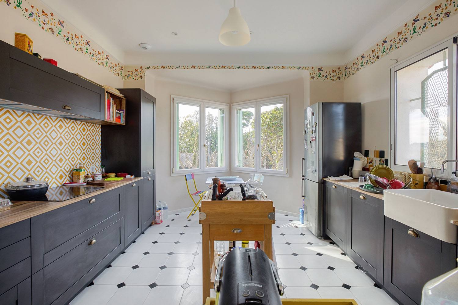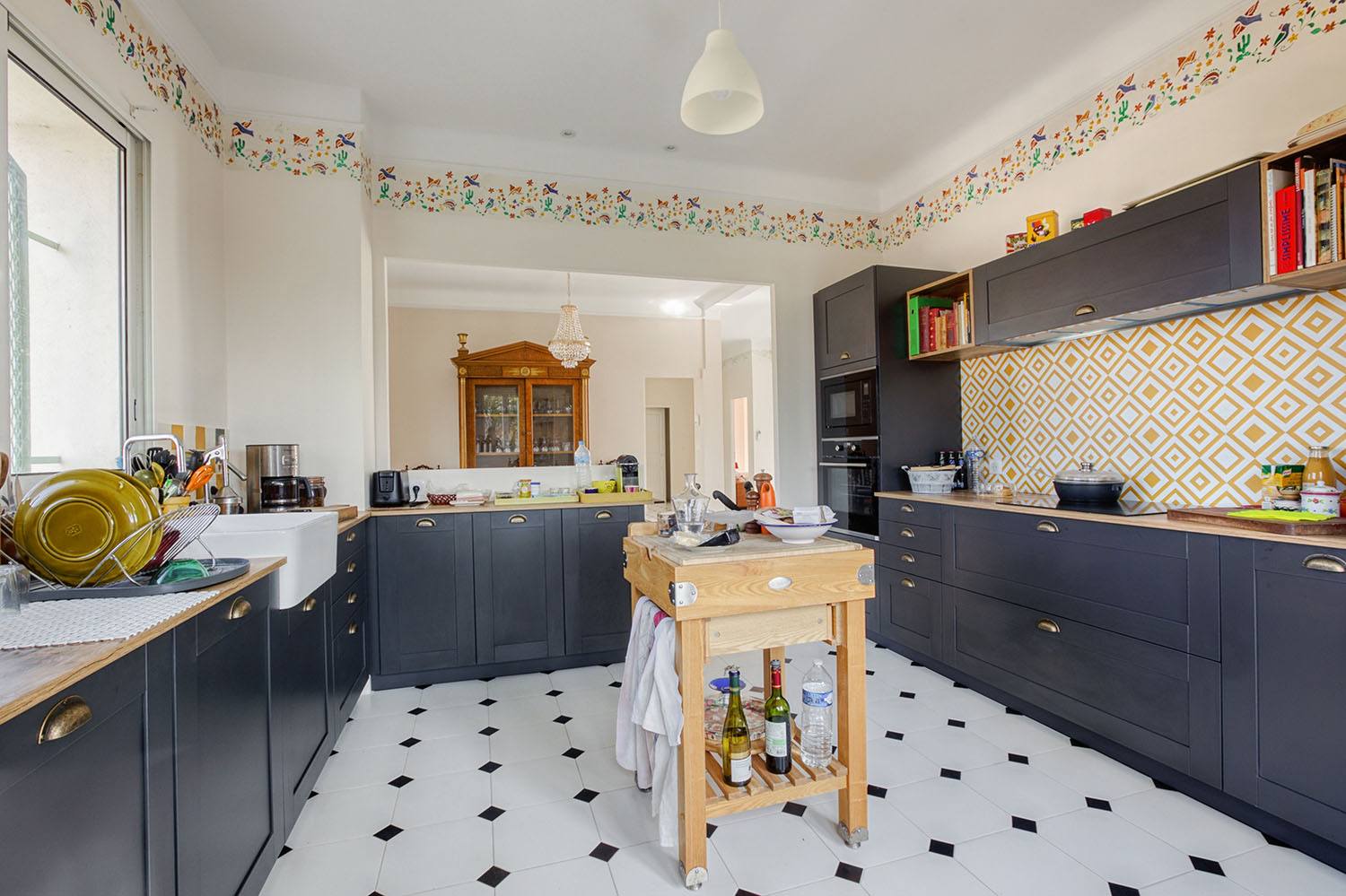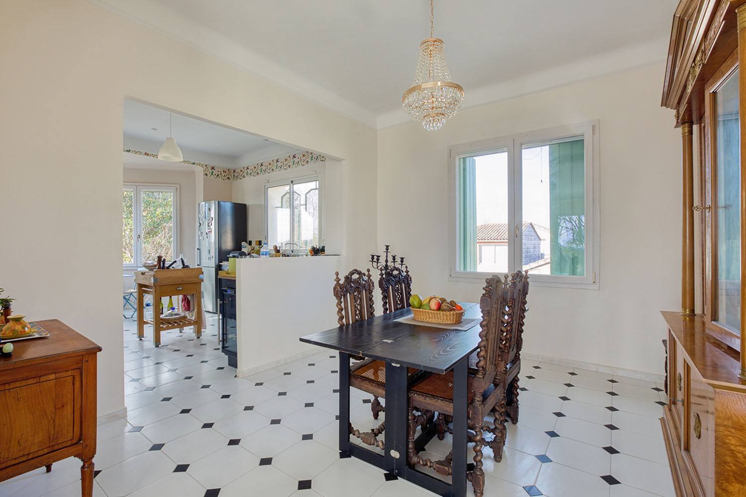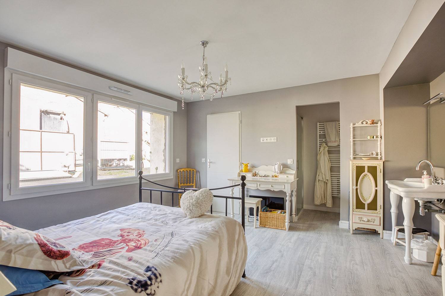 À l’étage, nous avons aussi remanié l’agencement des pièces : redistribution du coin nuit, rénovation de la cuisine, création d’ouvertures pour laisser entrer largement la lumière naturelle. La cuisine, la salle à manger et le salon ont leurs sols recouverts d’un carrelage octogonal blanc cabochon noir, apportant une note vintage à l’intérieur. Les spots intégrés au plafond créent une lumière douce et uniforme, une fois la nuit tombée. Et côté Coin nuit, la chambre au beau parquet gris clair prolonge cet univers rétro avec une splendide vasque sur pied et une coiffeuse d’antan. Bien évidemment, le niveau de confort est maximal avec l’isolation refaite, et des menuiseries extérieures neuves.