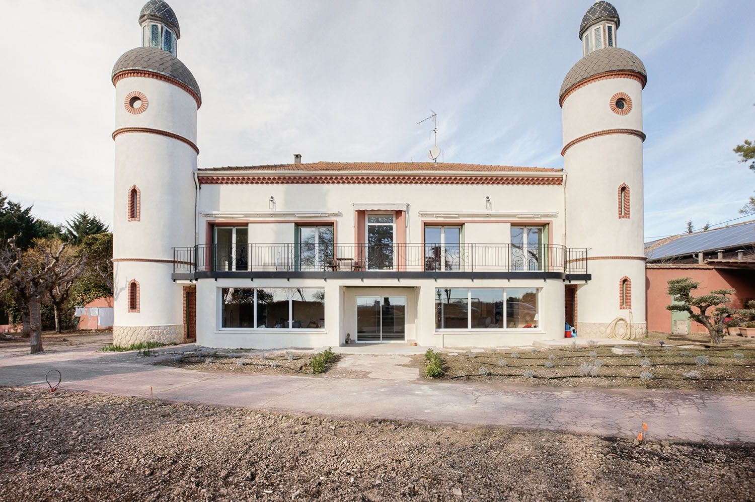 Côté aménagement extérieur, les travaux étaient aussi d’ampleur avec la démolition de l’escalier extérieur et l’isolation de la terrasse créée à l’étage. Les tourelles de cet ancien manoir initialement enduites d’un ocre rouge ont gagné en élégance en se parant d’un enduit blanc, magnifiant les contours des ouvertes en briquettes rouges.